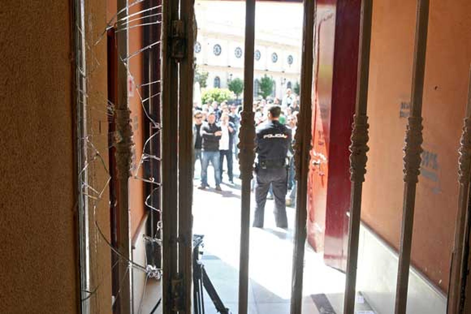 Alrededor de las cinco de la tarde, un grupo de unas cien personas se concentraba frente a la sede provincial del PSOE, en la plaza de San Antonio de la capital gaditana. Allí se esperaba la presencia de dirigentes socialistas que iban a participar en un acto por la tarde. Los ánimos cada vez más encendidos de los ex empleados llevaron a que la entrada de la sede sufriera diversos destrozos. Entre ellos, la rotura de un cristal de la puerta, además de pintadas. También hubo lanzamiento de huevos y pintadas en la sede local socialista en la calle Gaspar del Pino.