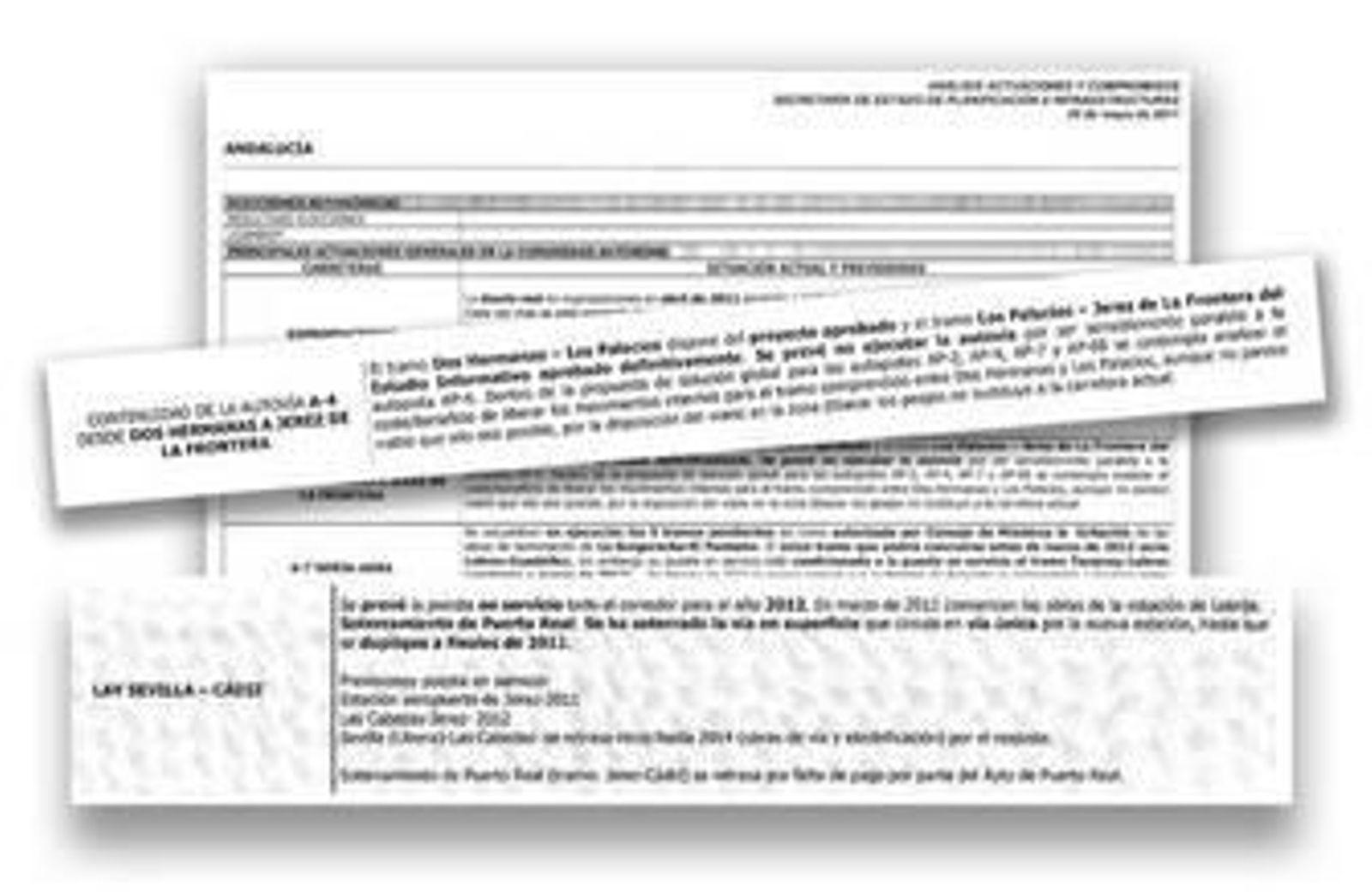 El documento señala que "se prevé no ejecutar" la autovía entre Sevilla y Cádiz y pospone a 2014 el inicio del tramo ferroviario Utrera-Las Cabezas · "Es sólo una hipótesis del escenario más negativo", alega el Ministerio