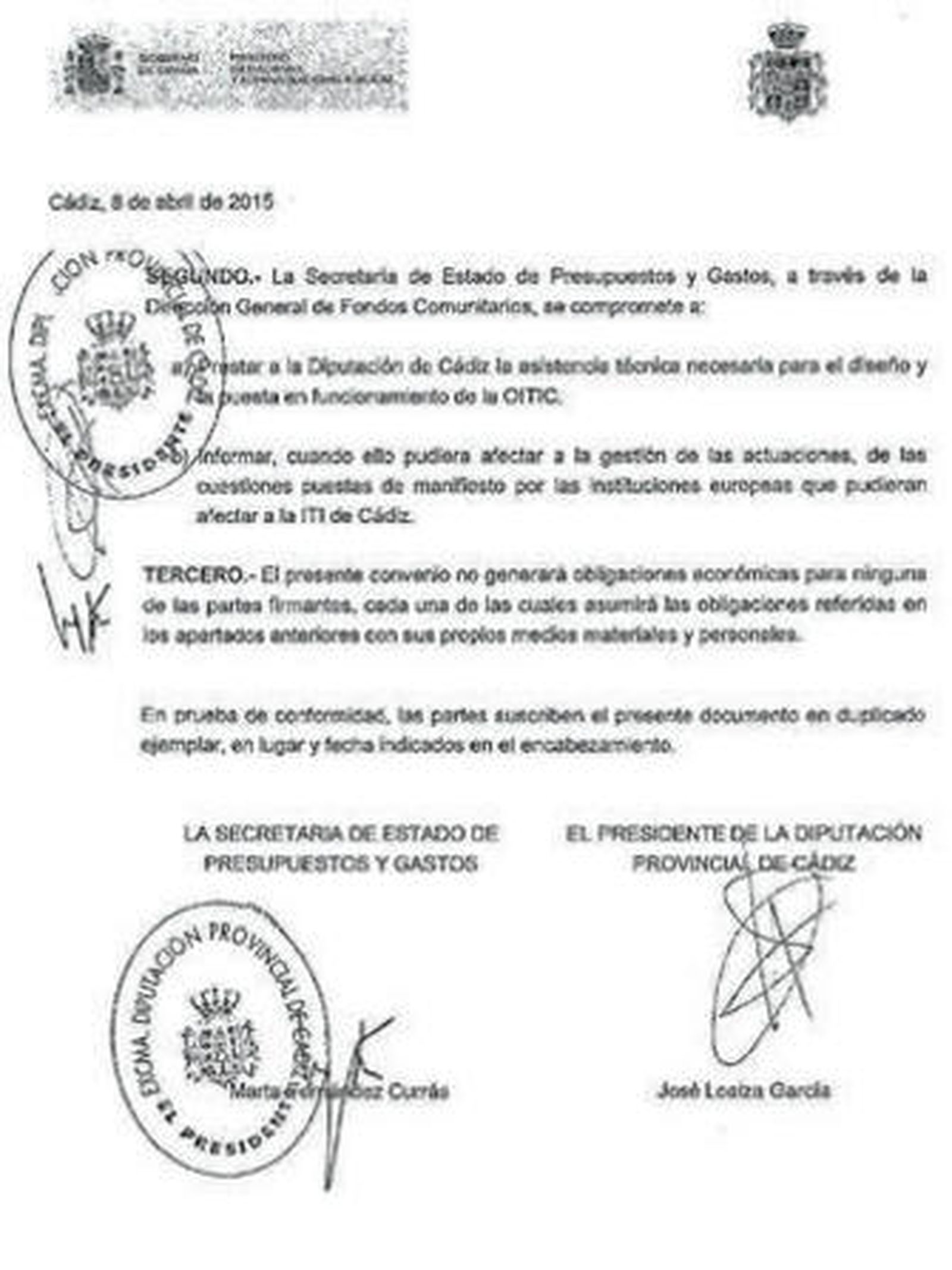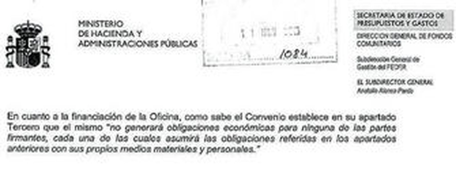 Textualmente, el convenio suscrito por Diputación y Ministerio el 8 de abril del pasado año, da cuenta del acuerdo para el desarrollo de la ITI en la provincia y, en el apartado segundo de acuerdos, señala: "La Secretaría de Estado de Presupuestos y Gastos se compromete, a través de la Dirección General de Fondos Comunitarios, a prestar a la Diputación la asistencia técnica necesaria para el diseño y la puesta en funcionamiento de la Oficina". En su apartado tercero, concluye: "El presente convenio no generará obligaciones económicas para ninguna de las partes firmantes, cada una de las cuales asumirá las obligaciones referidas en los apartados anteriores con sus propios medios materiales y personales". Es más, el pasado mes de noviembre, la diputada provincial Ana Carrera recibe una carta del subdirector general de la Secretaría de Estado de Presupuestos y Gastos del Ministerio de Hacienda en la que éste responde proporcionando información sobre la ITI. En esa carta, el alto cargo del Ministerio vuelve a recordar a Ana Carrera que, efectivamente, el convenio firmado no contempla obligaciones de financiación. Esto es lo que está escrito y lo que ayer mostró Carrera a Loaiza. Distinto es que en alguna reunión interna se le informara de la posibilidad de financiación.