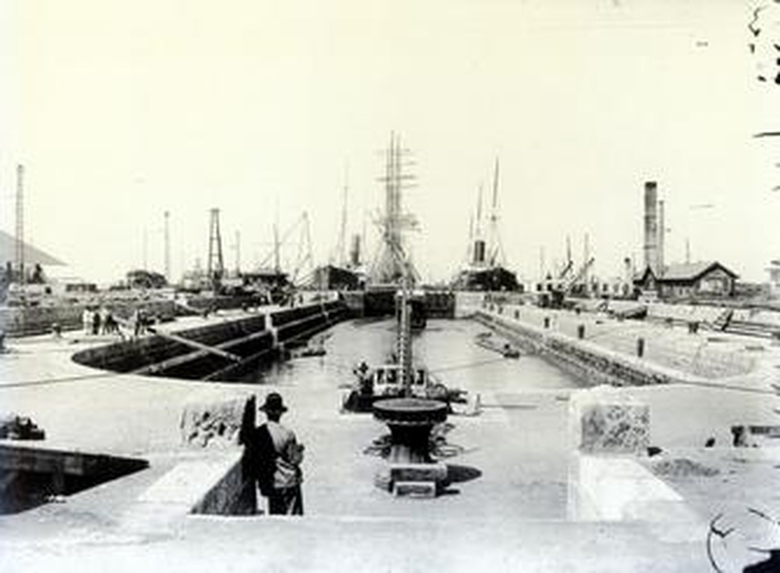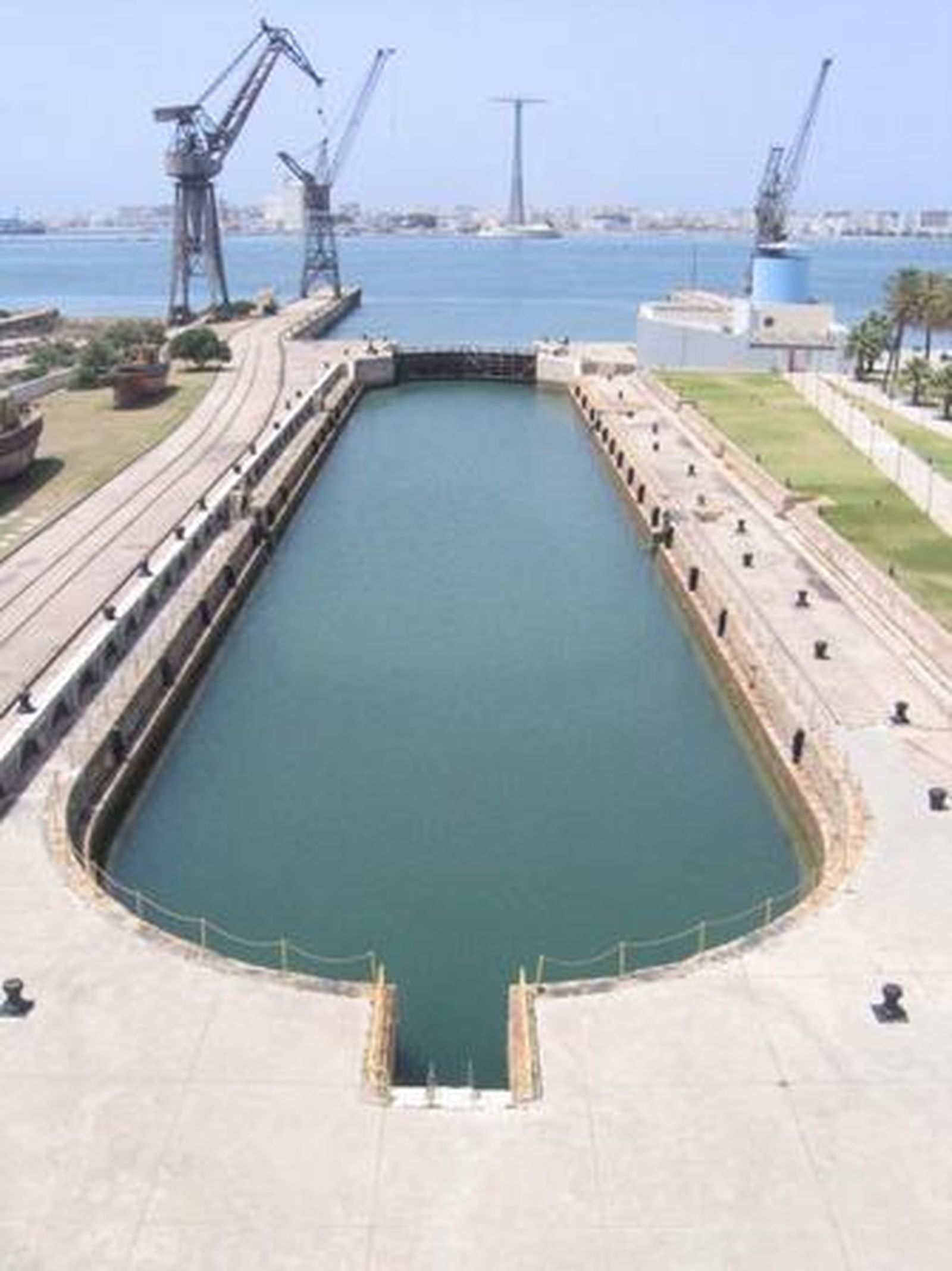 El texto continúa: "(...) En 1868, tras la renovación del contrato con el Estado por diez años, se decidió la construcción de un dique seco en la Bahía de Cádiz. El estudio de localización se encargó a la empresa inglesa Thompson & Noble, designando la playa de Matagorda, en el Trocadero, como el lugar más idóneo".