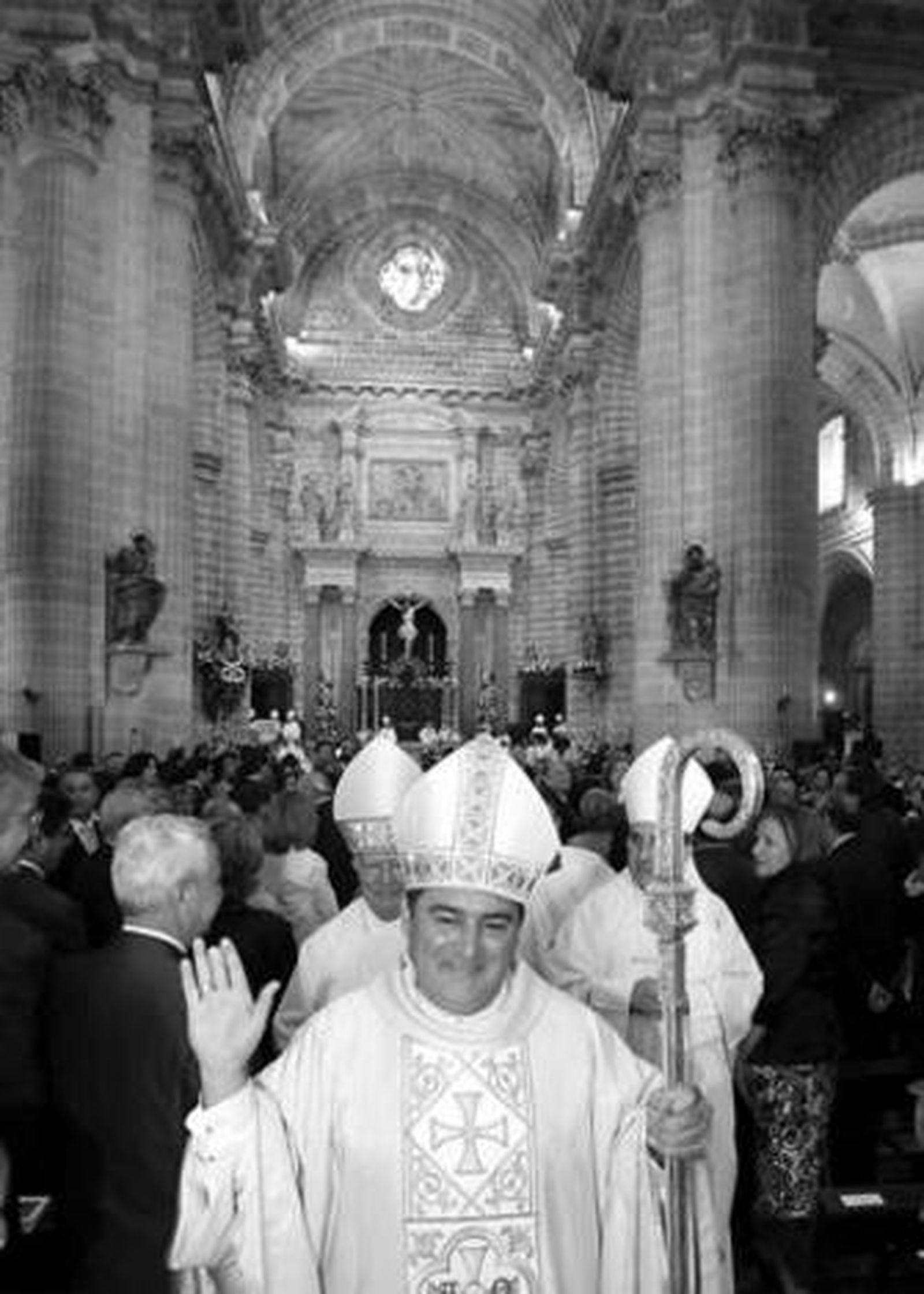 A las 12,25 del mediodía, José Mazuelos Pérez ya era obispo de Jerez y con su báculo en mano, ocupando la cátedra, recibía el contundente aplauso de las más de 1.600 personas que abarrotaron la Catedral. Eso sucedía hora y media después de iniciarse una celebración de enorme solemnidad, muy bien organizada y brillante en muchos aspectos. No en vano se trataba de ordenar y recibir al tercer obispo de Asidonia-Jerez para lo que no se reparó en medios y capacidad de organización con el concurso de numerosos voluntarios repartidos por los muchos frentes de trabajo que tuvo la misa de pontifical. En la brillantez de la ceremonia tuvo mucho que ver la coral y orquesta de la Catedral que desarrolló un repertorio variado, rico en matices musicales y adecuado a cada momento de la celebración, todo bajo una magnífica interpretación y dirección, con Ángel Hortas al frente. Y por supuesto, otra pieza clave en el éxito fue el trabajo de la dirección de liturgia que asumió el sacerdote y canónigo maestro de ceremonias de la Catedral de Sevilla, Luis Rueda, cuya participación fue sencillamente excelente demostrando una gran preparación para la dirección de ceremonias de enorme complicación litúrgica como la de ayer. El apoyo del episcopado fue explícito con la presencia de 14 prelados españoles y dos cardenales, uno de ellos el de Bogotá ciudad en la que dio sus primeros pasos en el sacerdocio José Mazuelos. No faltó el clero diocesano y otros sacerdotes que se sumaron a la ordenación "de un amigo". En la amplísima representación civil destacaron las alcaldesas de Jerez y Osuna así como de otras localidades de la diócesis; de la Universidad de Sevilla y de la Pablo Olavide; del Poder Judicial, de su pueblo natal, de las instituciones en las que ha estado, participado o colaborado, de organismos diocesanos de la capital hispalense, de la hermandad de Los Estudiantes de la que era su director espiritual, y por supuesto, su familia con su madre a la que al final le dijo directamente: "mama no pudiste estar en mi ordenación sacerdotal pero Dios te ha regalado estar en mi ordenación episcopal". Su progenitora estuvo al frente de un amplio grupo formado por sus hermanos, sobrinos y demás familia que en no pocas ocasiones pudieron contener las lágrimas de emoción de ver cómo este sacerdote nacido en Osuna, donde ejerció de médico, que fue párroco en Sevilla y Lora del Río, que ayer se acostó como presbiterio y hoy lo hará como obispo, posaba investido con los atributos episcopales que le fueron entregados en el transcurso del ritual de ordenación de obispos que se asemeja enormemente a la ordenación de los sacerdotes excepto en la unción con el Santo Crisma que recibió en la cabeza y que ésta es cubierta por el evangelio.