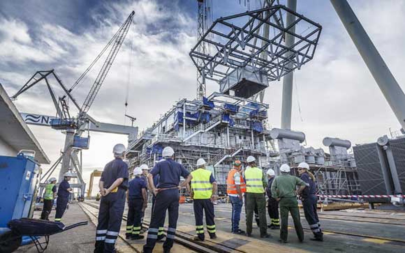 Según ha indicado Navantia en un comunicado, con el montaje del último bloque de acero se finaliza el proceso de montaje de la estructura de los módulos Top-Side, con un peso de 5.500 toneladas. Además, ha destacado que los trabajos de montaje se iniciaron el pasado 19 de junio y en menos de tres meses se ha conseguido armar la estructura completa.