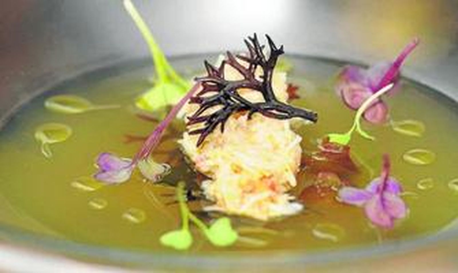 El chef catalán, que se encargaba del trabajo con los crustáceos en el show de Barbadillo, remató la faena con esta receta, muy celebrada en el salón: un consomé con un toque cítrico elaborado con galeras, citronella, kéfir, jengibre, una pimienta asiática y otras especias, que después se consolida con gelatina para sostener una carne de buey de mar desmigada.