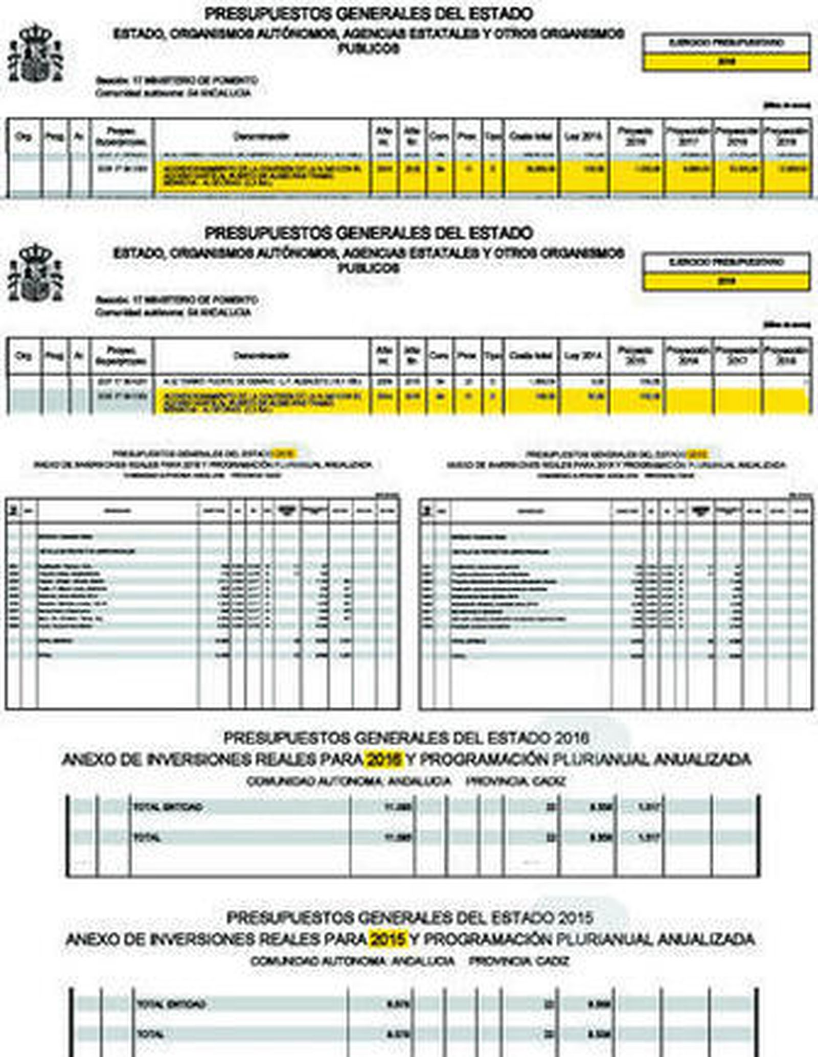 En el documento presentado por Montoro se reconoce, según CCOO, que Adif terminará la renovación de la línea férrea Bobadilla-Algeciras en 2020, "tres años más tarde de lo que estimaba el año pasado". Y que acabará la línea Sevilla-Cádiz un año más tarde de lo estimado en 2014, en 2017. Inversiones pendientes del Ministerio de Fomento como la Alta Velocidad Bobadilla-Ronda-Algeciras se retrasa un año, dos años el tramo de la A-48 Vejer-Tarifa-Algeciras o la duplicación de la N-350 (acceso sur al Puerto de Algeciras). En cualquier caso, según el sindicato, la palma se la lleva el retraso de cuatro años en el acondicionamiento de la conexión de la N-340 con el acceso norte al puerto de Algeciras (Menacha-Algeciras). Y califica de "sangrante" que la consignación para la línea Algeciras-Bobadilla sea sólo de 56 millones, "minúscula para afrontar un proyecto valorado en 1.153 millones de euros, que queda a la espera de fondos de otras entidades públicas, según ha explicado el propio PP".