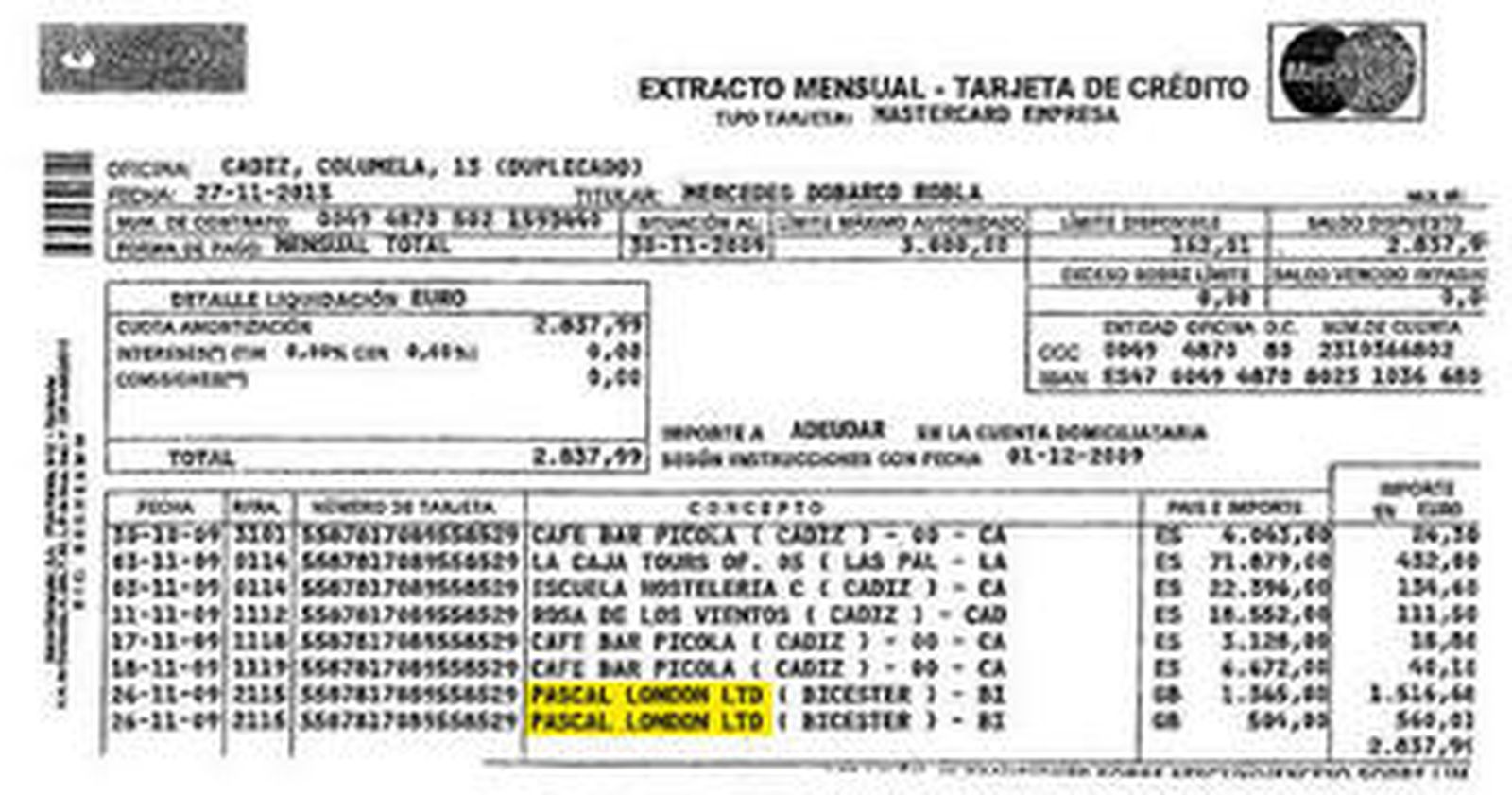 Sobre algunos apuntes en la tarjeta, Dobarco ofrece explicaciones. Dentro de la documentación que la UCA entregó al consejo social se encuentra un apunte que debería haber sido eliminado. Se trata de un gasto de 2.076 euros en una tienda de diseño de Londres. Dobarco explica que fue "una compra fraudulenta realizada en el extranjero por usurpación de identidad". La entidad bancaria que emitió las tarjetas devolvió el montante de esta operación a la Universidad.