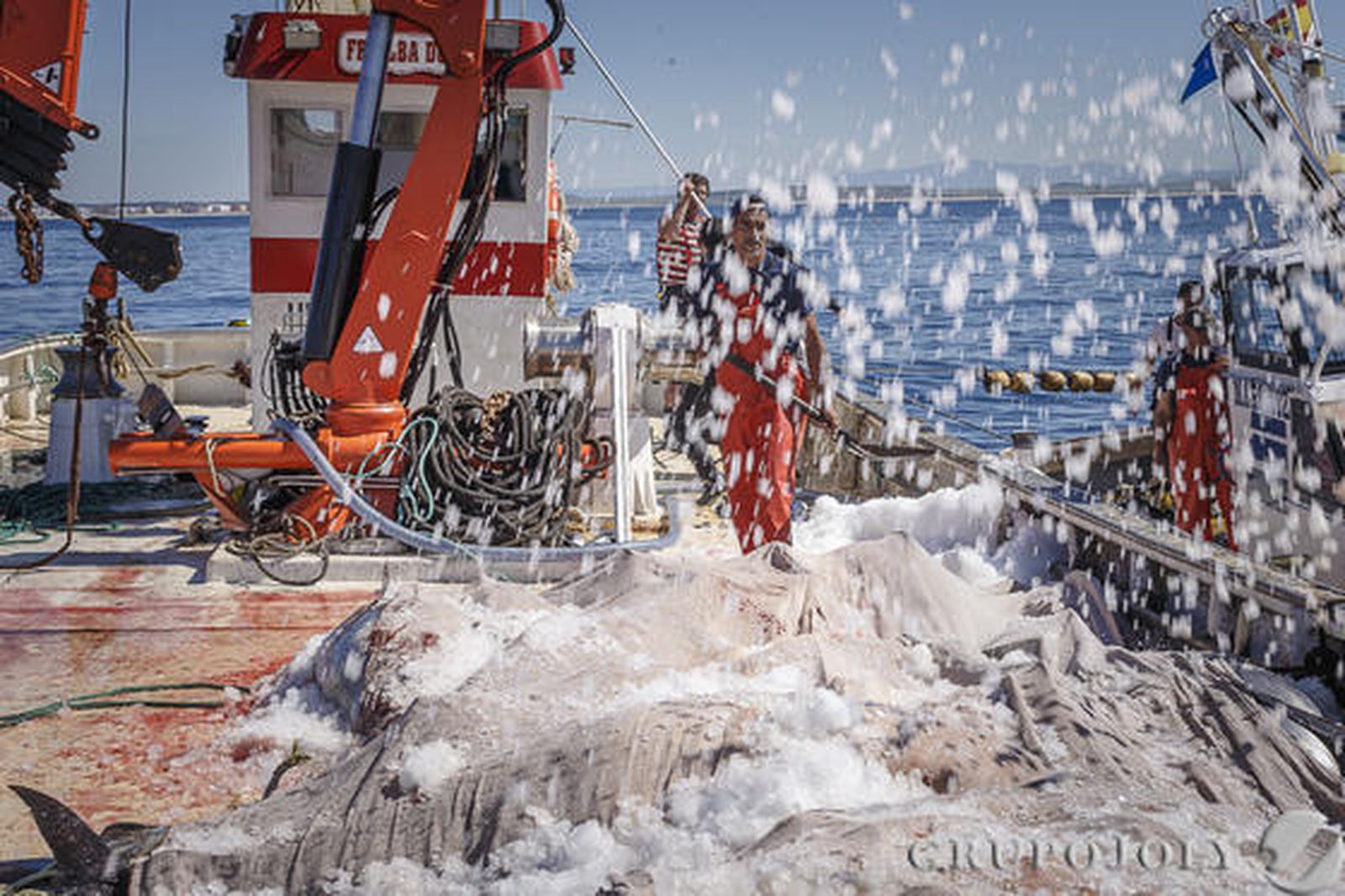 Antes de que su majestad el atún se deje ver, con sus tonos amarillos en el lomo resplandeciendo cual bandera, un ejército de melvas los precede frenéticas. Han quedado atrapadas entre las redes de la almadraba, aunque no son ellas las estrellas del espectáculo.