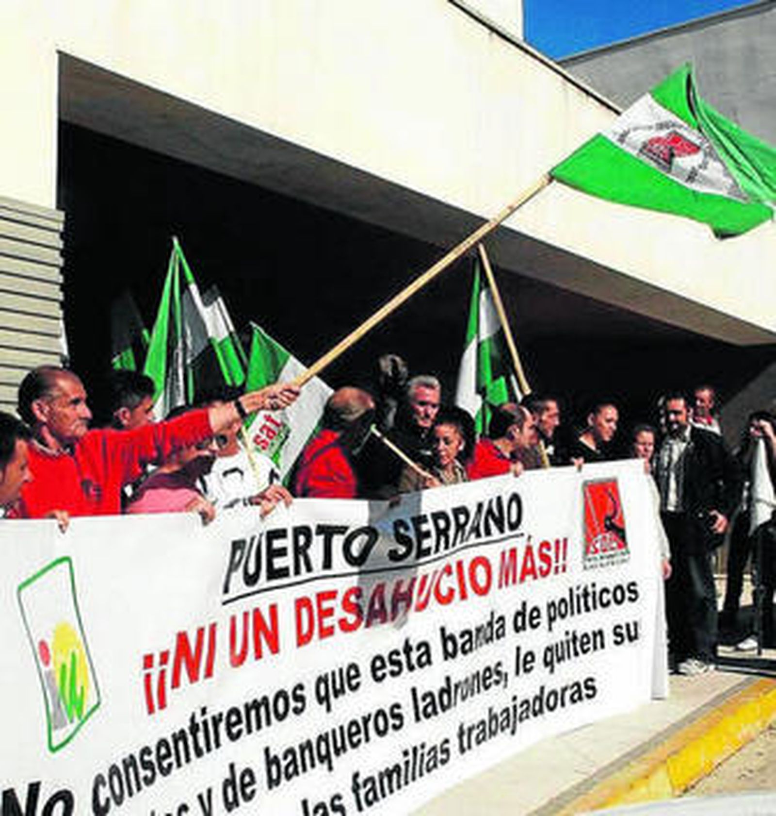Es la segunda vez que el SAT e IU de Puerto Serrano se apostan, en varios meses, a las puertas de los juzgados para evitar desahucios. Varias docenas de vecinos se concentraron ayer para pedir medidas que eviten esta situación. El responsable del SAT, Diego Cañamero, exigió en este emplazamiento una "normativa clara" para evitar los desahucios de los trabajadores. "Hay muchos problemas de hipoteca. Pedimos que los trabajadores que no lleguen al salario mínimo que paguen los intereses de los préstamos, no la deuda, hasta que puedan hacerlo", explicó.