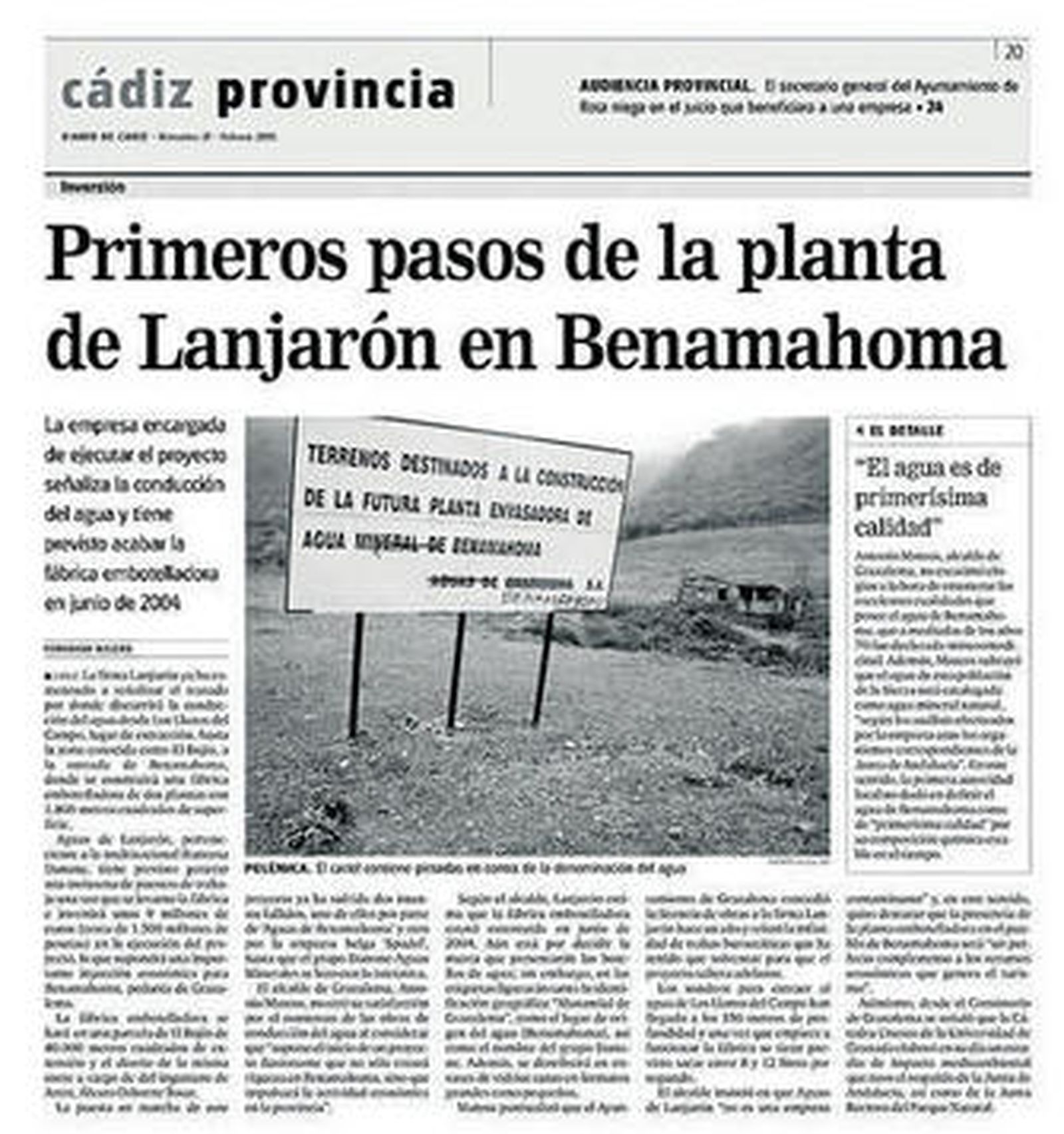 El proyecto de construcción de esta embotelladora fue solicitado a finales de la década de los 90 por la empresa Aguas de Grazalema SA, filial de Aguas de Lanjarón, perteneciente a la multinacional francesa Danone-Aguas Minerales. La iniciativa, sustentada en la exquisita calidad de este agua, preveía en principio que la captación se hiciera desde el mismo nacimiento del manantial, en el corazón de Benamahoma, para desde allí conducirla hasta la planta embotelladora que Lanjarón intentó levantar en una extensión de unos 40.000 metros cuadrados ubicada en la finca El Bujío. La empresa, incluso, planteó los primeros movimientos de tierra (ver documento adjunto) aunque se frenó en seco debido a la oposición social que el proyecto originó en Benamahoma, donde los vecinos estaban convencidos de que las obras podrían afectar al manantial.