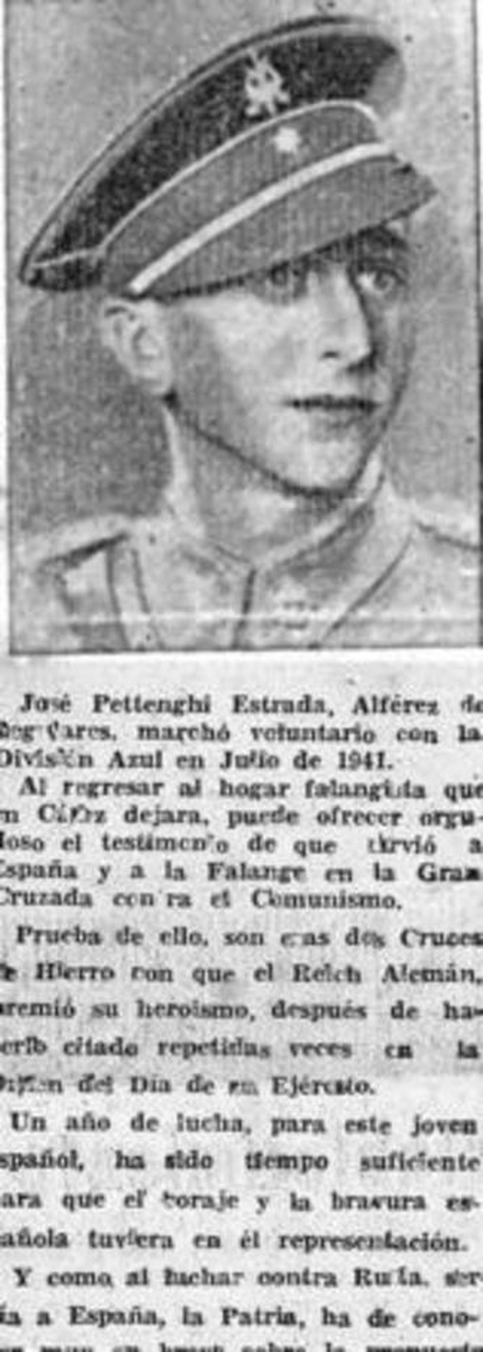 En internet se puede comprar por 400 euros el distintivo usado por el coronel gaditano José Pettenghi en el frente ruso, durante su campaña con la División Azul. Son los restos de la historia a subasta. Este verano se cumplirá el 70 aniversario de la marcha de un grupo de chavales camino de Rusia a vivir la aventura de sus vidas... o a morir en ella. Henchidos de orgullo patrio acudían a la llamada de la Falange para formar un cuerpo de soldados españoles que apoyaran la campaña alemana. La División Azul fue diseñada por el cuñado de Franco, Serrano Suñer, el español más germanófilo, para apoyar a Hitler sin vulnerar la supuesta neutralidad en la contienda.