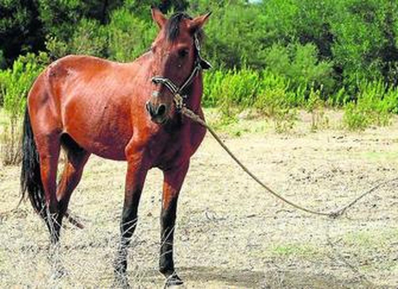 Los testigos que han relatado con crudeza la escena de La Zarzuela piden anonimato, pero esperan que la próxima vez alguien haga algo, ya que no lo hicieron ninguno de los cuarteles de la Guardia civil que la noche del concurso fueron avisados de que se estaba produciendo un delito. El maltrato animal es un delito. Así figura en el artículo 337 del Código Penal y se castiga con penas de tres meses de cárcel a un año si, como en este caso, se produce ensañamiento. Pero el artículo 337 no impide que en un claro de la urbanización Atlanterra, desde hace más de un mes, un jamelgo se encuentre amarrado a una argolla con una cuerda de unos diez metros. El círculo que puede trazar es todo su habitat, un extraño habitat de un animal abandonado rodeado de unifamiliares de alegres colores con el mar de fondo. Y el círculo ya está seco, el caballo ha comido todo lo que puede comer del suelo; le queda la arena. Una bañera con menos de un dedo de agua es su abrevadero. Podemos adivinar su biografía observándolo. Sabemos que tiene más de veinte años porque una X en el lomo es la marca de los équidos españoles que vivieron la epidemia de peste equina del 91. Sabemos por su hierro que fue un caballo militar. Y sabemos por sus cicatrices que ha sufrido, que ha sufrido mucho. En su nariz tiene la señal de la serreta, en las patas la de las trabas con las que aún, en algunos sitios, se amarra a los caballos para inmovilizarlos; los tendones también han sido trabajados con golpes. El final de sus días, que parece próximo - "no pasará de este invierno", nos ha dicho un vecino que se apiada de él y le lleva comida-, será éste, haciendo círculos por los límites de su cuerda.