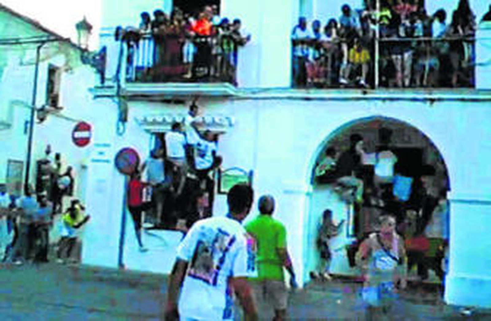 Un vídeo colgado en Youtube muestra el momento en el que la mujer es sorprendida por el toro bajo los arcos del edificio consistorial.