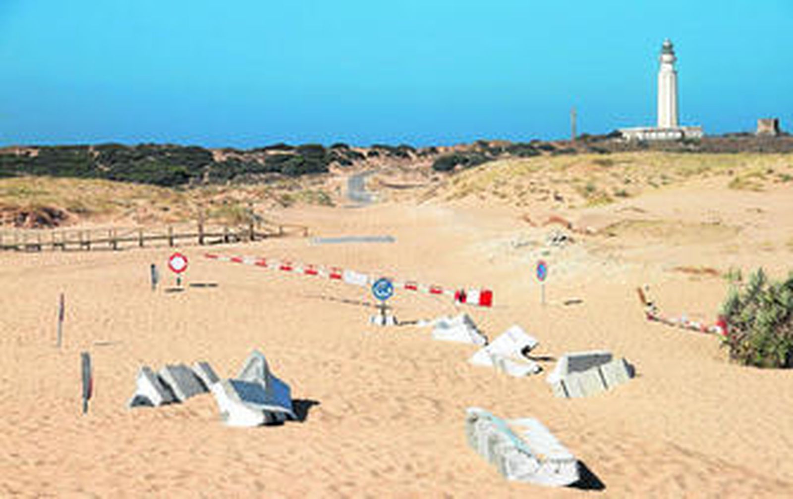 El problema llegó hace unas tres semanas. El temporal de levante empujó la duna que desde hace unos diez años comenzó a formarse cerca de la carretera del faro. La empujó tanto, que enterró la carretera y engulló la glorieta hasta la que podían llegar los automóviles para dar la vuelta al encontrarse con la barrera que les impedía continuar. ¿Nunca había ocurrido? "Nunca, nunca, nunca", afirma Juan Antonio Moreno, presidente de la asociación de vecinos Cabo de Trafalgar.
