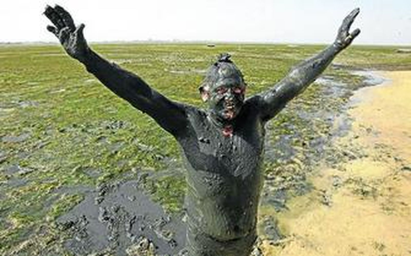 La marea está baja y, por tanto, la playa completamente desierta. Tan sólo dos personas pasean por la orilla. Un caño pequeño de agua les sirve para refrescarse. Ellos prefieren no embadurnarse de barro. "Nunca lo he hecho, además luego es muy difícil quitarlo", comenta una señora que pasea. Sin embargo, otro hombre decidido no duda en meterse en el agua, hasta las rodillas, y untarse el cuerpo por completo de fango. Y es que esta acción es habitual en la playa de La Cachucha, que se ha erigido como un balneario natural.
