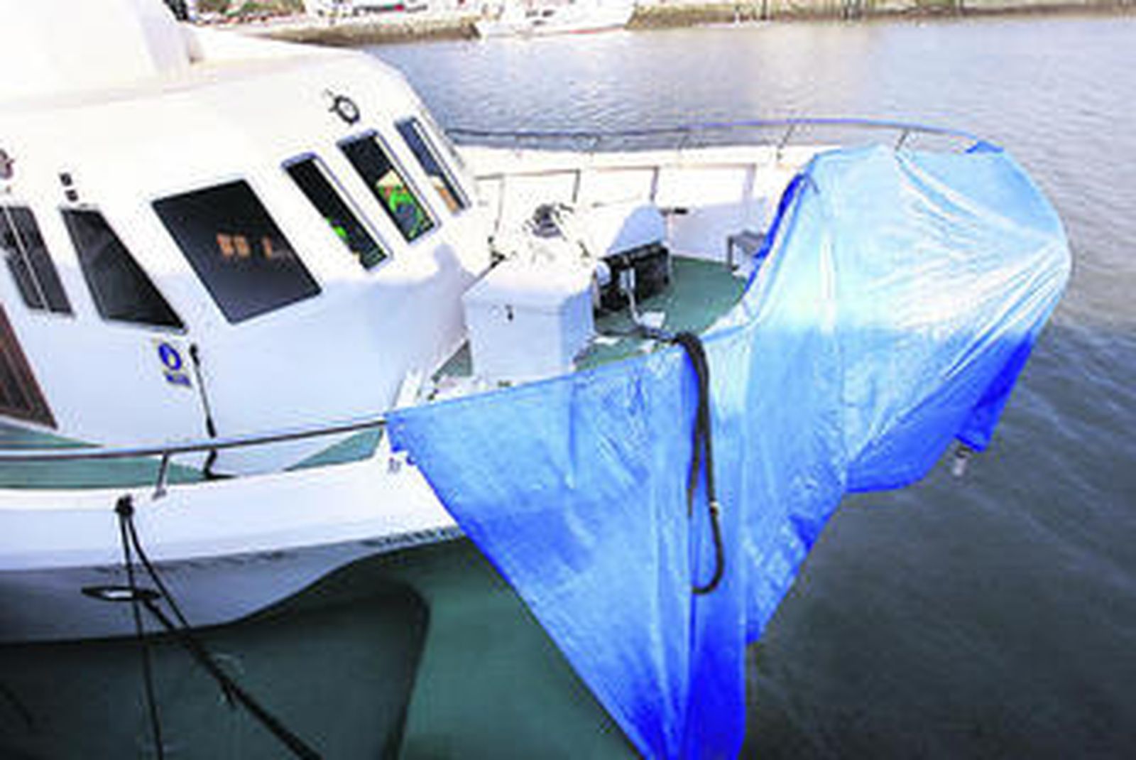 El catamarán accidentado se encuentra en El Puerto recubierto por una lona azul a la espera de que se realice la reparación.