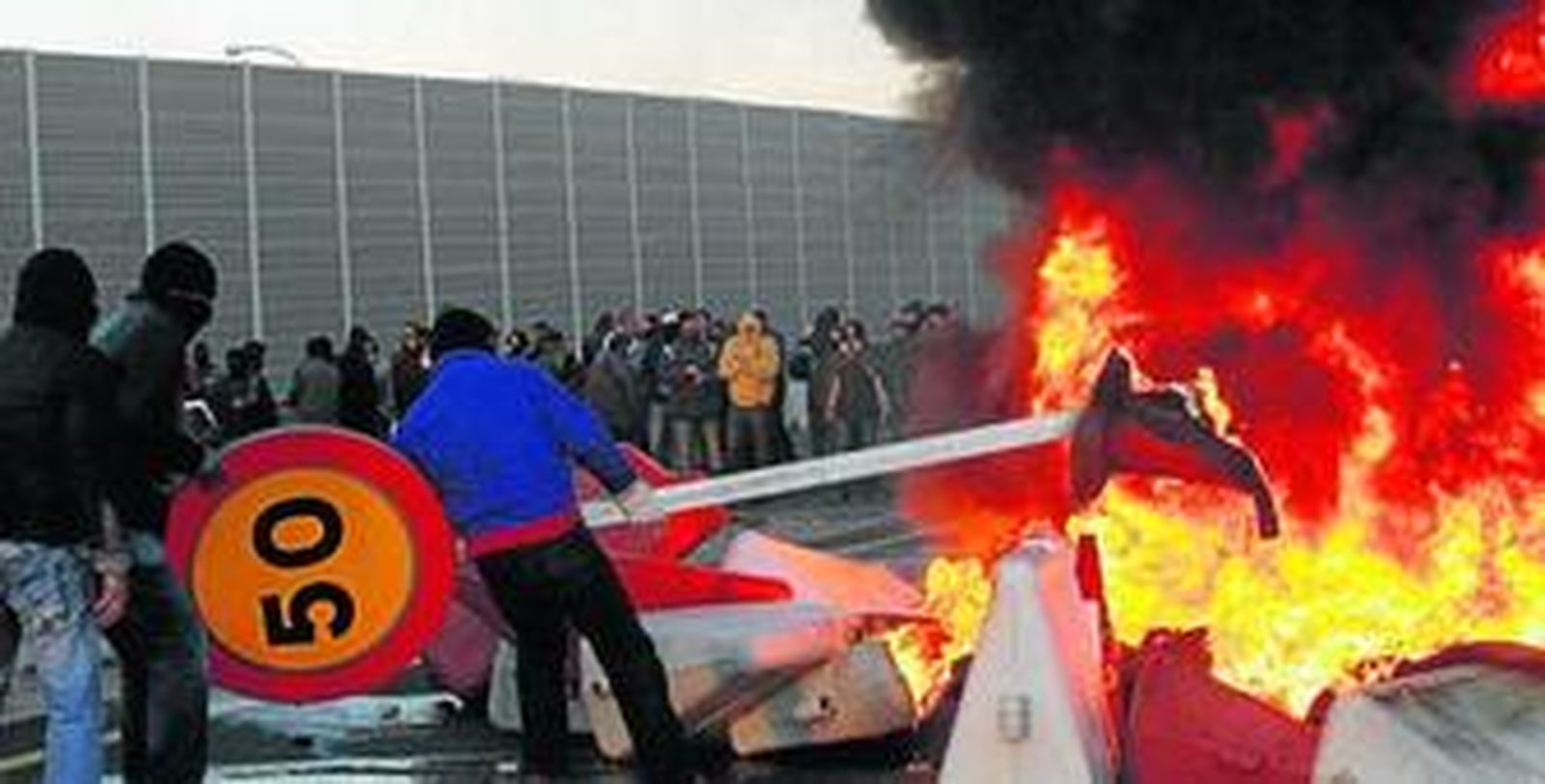 Por otra parte, los ex empleados volvieron a manifestarse por sorpresa, en esta ocasión, en la tarde de ayer. Un nutrido grupo se reunió en el lateral de la antigua fábrica, junto a la autovía de acceso a Cádiz (a la altura del Río San Pedro). Allí desplegaron varias pancartas a lo largo de la antigua fábrica en las que podían leerse lemas contra la Junta de Andalucía, exigiendo planes de empleo para la Bahía de Cádiz o recordando el alto número de desempleados. A continuación, protagonizaron un nuevo corte de carretera y prendieron fuego a varias barricadas, utilizando para ello diverso material. Aunque varios vehículos de la Policía Nacional acudieron, no hubo incidentes, aparte de las colas de tráfico que se ocasionaron por la protesta.