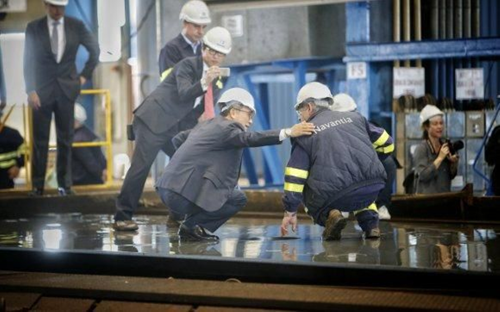 Y esa nueva alianza navantiacoreana se plasmó con la presencia del embajador de Corea en España, Park Hee-Kwon, quien también estuvo pendiente de cada instante, de cada maniobra. Tras esa seriedad y meticulosidad del corte de chapa, se pasó a la ceremonia oficial. En ella se dio cuenta de que el de ayer fue un día histórico (o "semana histórica", como dijo el delegado del Gobierno en Andalucía, Antonio Sanz), porque supone la vuelta a la construcción de petroleros por parte de Navantia más de dos décadas después.