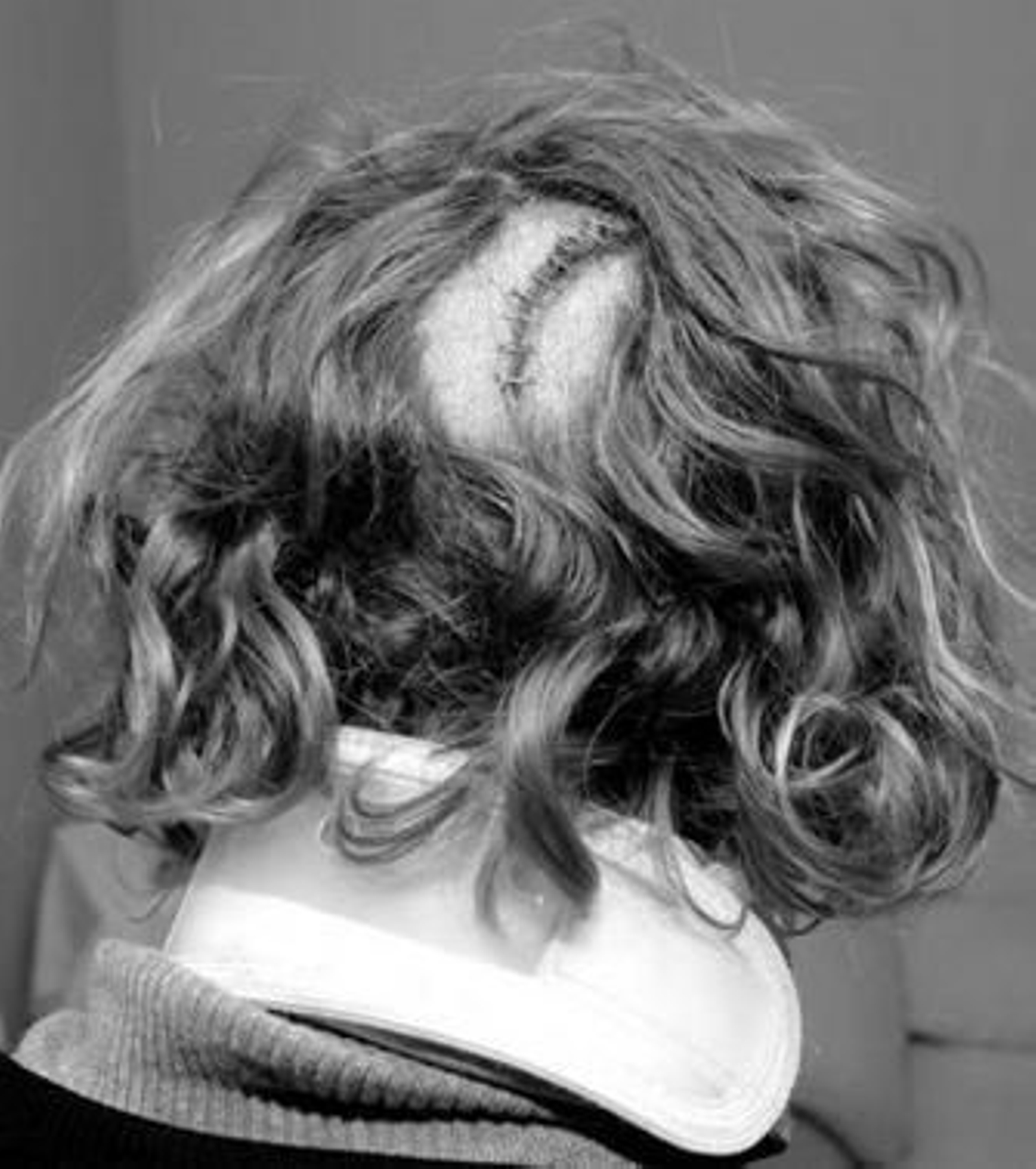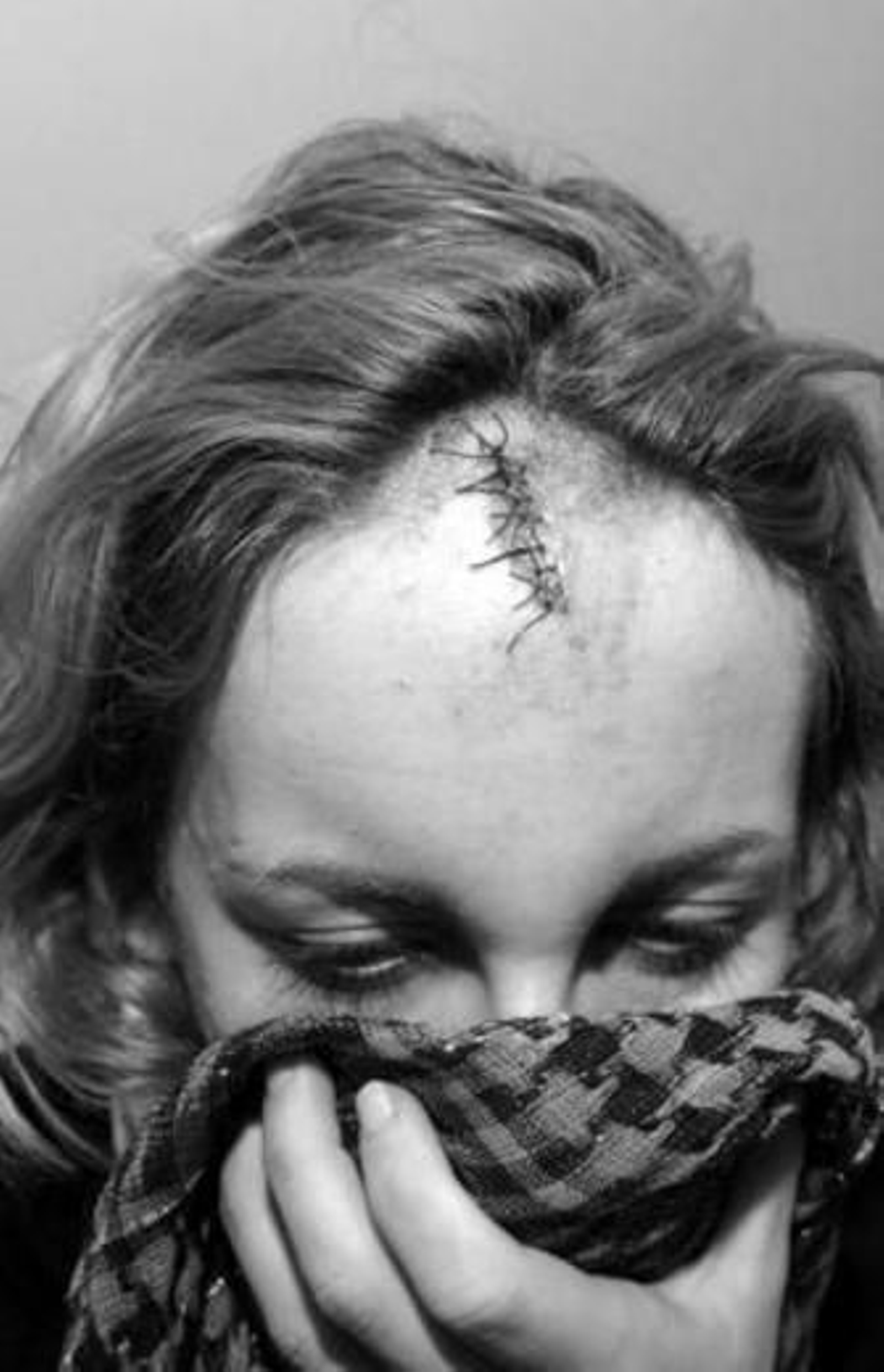 Por la noche, lograba dejar el hospital con un collarín en el cuello, y brechas enormes en la frente y en la cabeza. Diez grapas le han puesto en la cabeza, y trece puntos de sutura en la frente, y tiene las piernas llenas de cardenales y los tobillos amoratados.