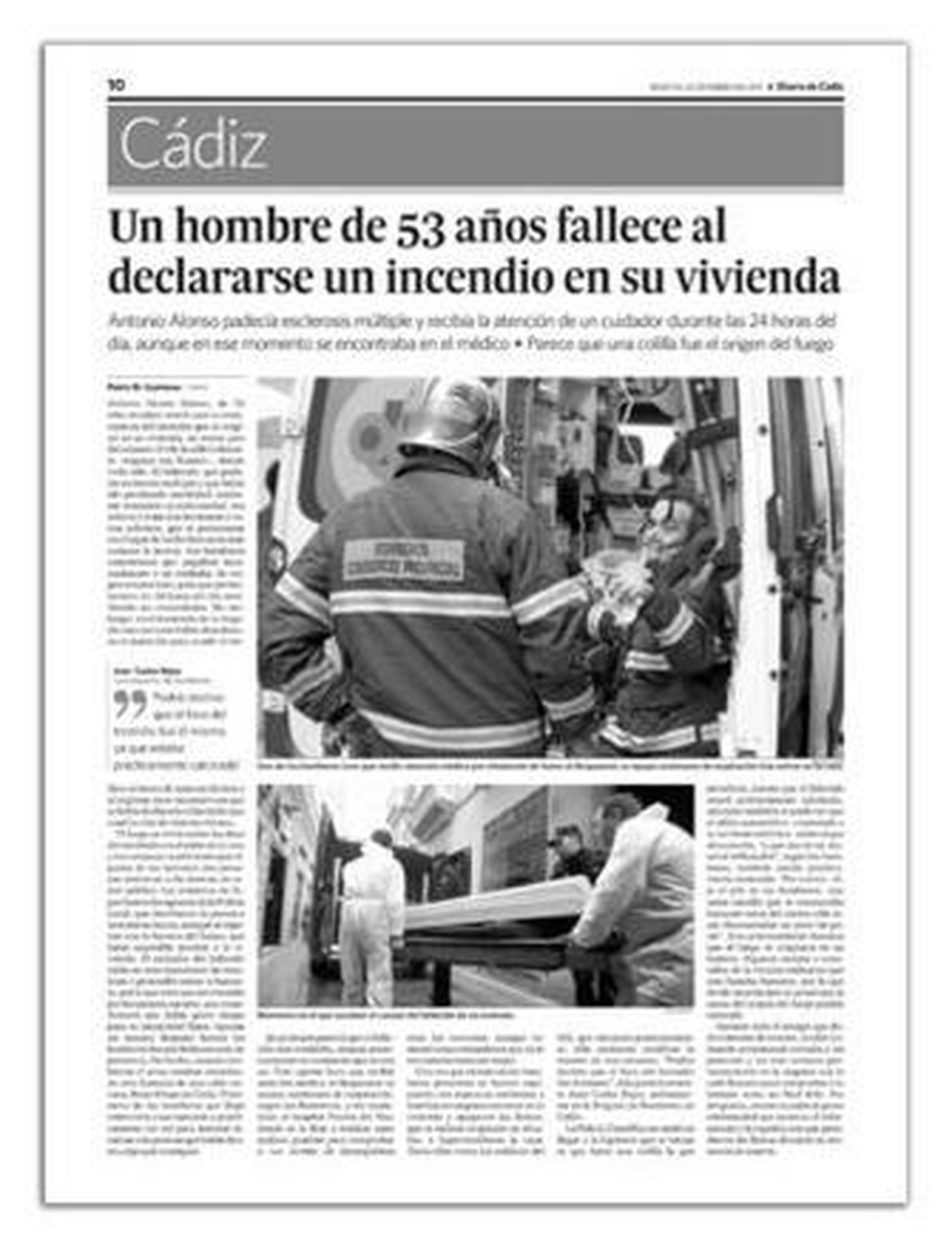 En el caso del incendio de 2011, pudo estar originado, tal y como constata la información publicada por Diario de Cádiz al día siguiente del suceso, por una colilla. De hecho, el cuerpo apareció totalmente calcinado, así como un sillón automático que pudo prender por culpa de este cigarro.