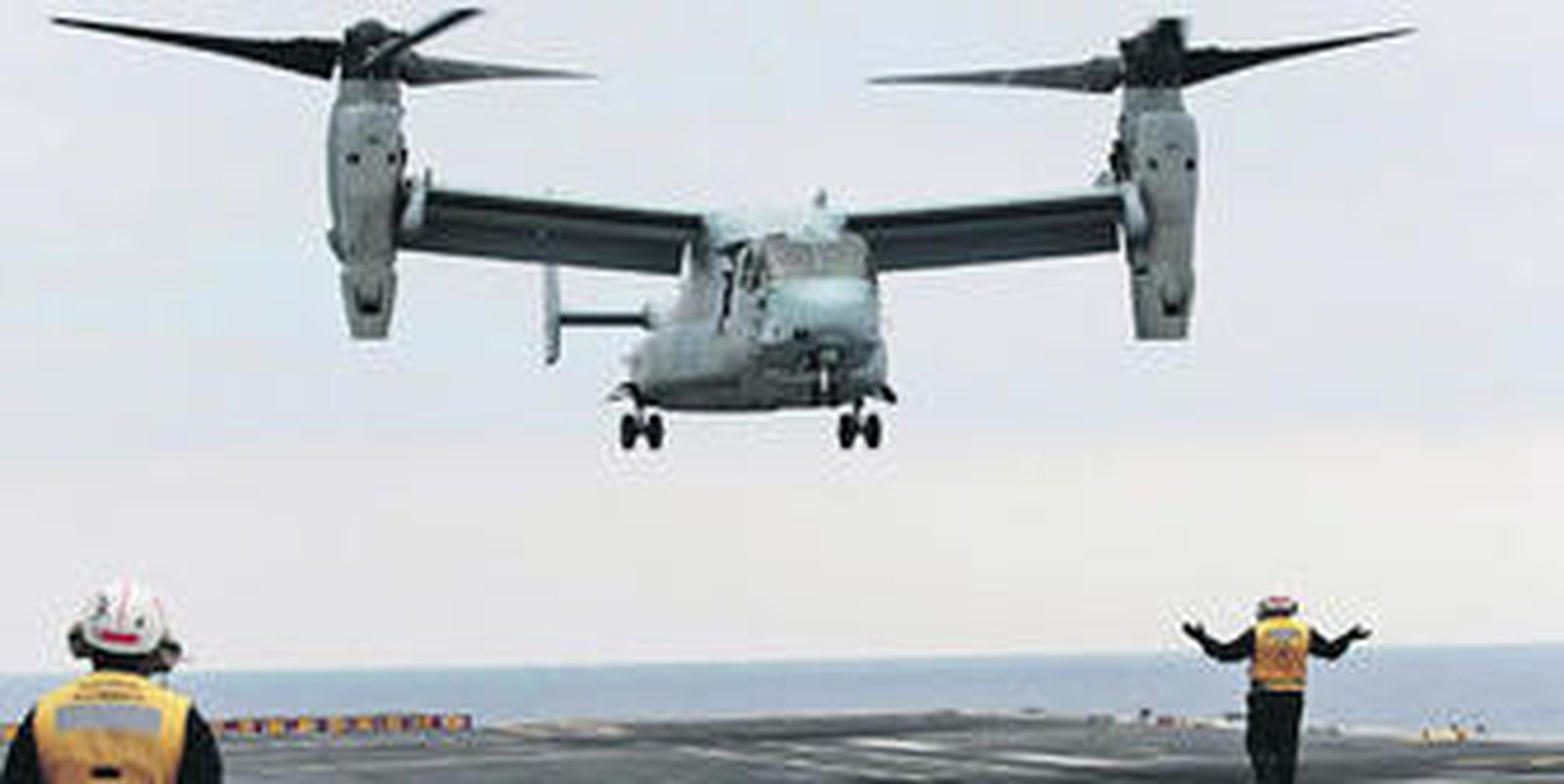 El halieto de los marines estadounidenses aparece antes de diez minutos. Viene en vuelo directo desde Morón de la Frontera (Sevilla), donde se halla destacado junto a otros once convertiplanos. Su cometido es brindar transporte aéreo a los infantes de marina del Grupo de Respuesta Especial a Crisis (SP-MAGTF, por sus siglas en inglés), el contingente militar norteamericano acantonado en dicha base española, y cuyo área de operaciones abarca todo el Mediterráneo y el continente africano hasta su franja ecuatorial.