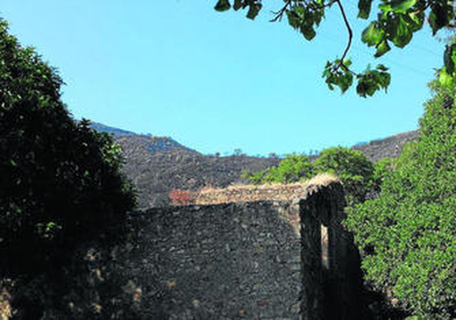 Pasando el antiguo puente ya el senderista se topa de frente con las cenizas, y es justo atravesándolo cuando el olor a vegetación calcinada se hace más presente y ahí aparece el cartel que recuerda "peligro de incendio forestal". Conforme se camina el agua se deja sentir a la izquierda, siendo además visible su paso, y a la derecha se intuye el arduo trabajo que los efectivos del Plan Infoca tuvieron que desarrollar la noche del 24 de julio y madrugada del 25, ya que a pie de sendero van cayendo restos de cenizas, que conforman charcos negros por la humedad propia del terreno, ya que a pocos metros hay una fuente natural casi entre altares ennegrecidos.