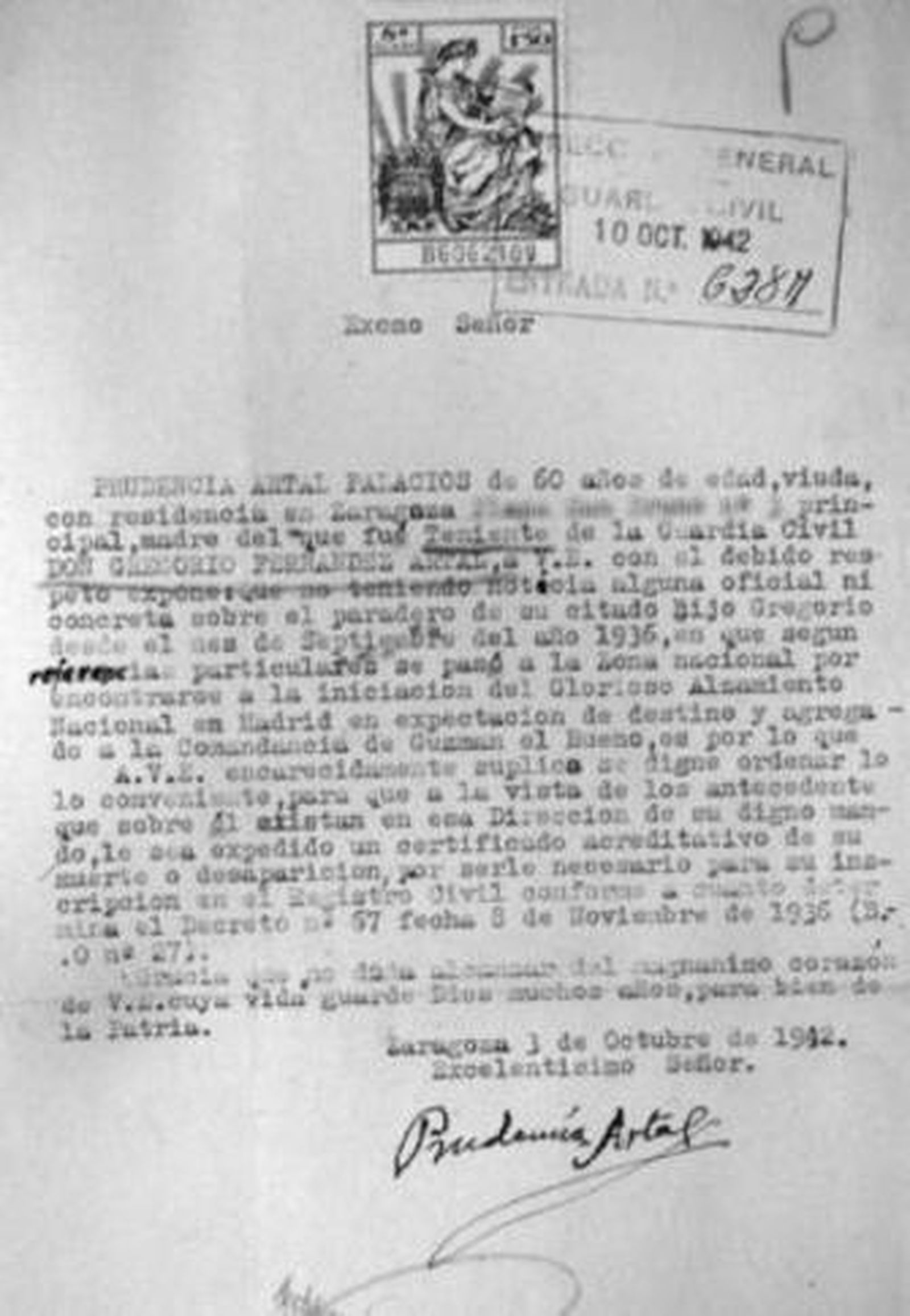Finalizada la guerra y dada su condición de "desaparecido", no podía ser inscrito su fallecimiento en el registro civil, por lo que el 3 de octubre de 1942, su madre solicitó al director general de la Guardia Civil un certificado sobre su situación, "no teniendo noticia oficial ni concreta sobre el paradero de su citado hijo Gregorio desde el mes de septiembre del año 1936, en que, según referencias particulares, se pasó a la Zona Nacional por encontrarse a la iniciación del Glorioso Alzamiento Nacional en Madrid".