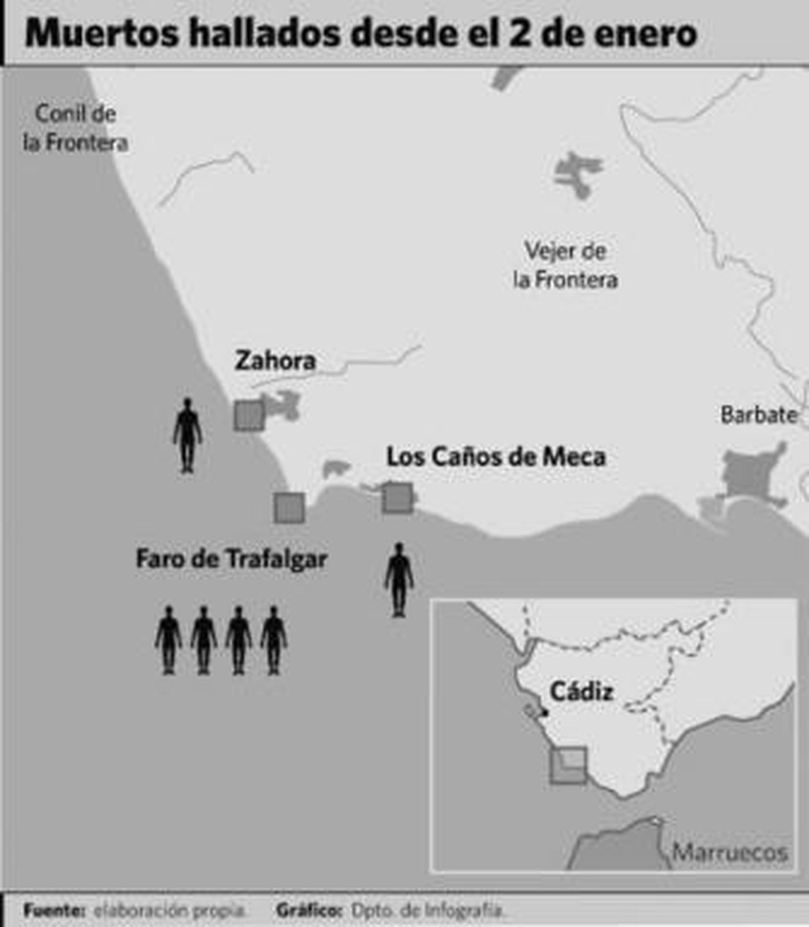 El paulatino descubrimiento de muertos en las playas de Trafalgar no cesa desde que en Nochevieja alcanzara la costa una zódiac neumática de siete metros de eslora con diez inmigrantes a bordo. Horas más tarde todos ellos fueron detenidos por la Guardia Civil deambulando por el Parque Natural de la Breña y Los Caños de Meca. Dos días después apareció el primer cadáver. Se trataba de un joven magrebí de 20 años cuyo cuerpo apareció flotando en aguas de la playa de Zahora.