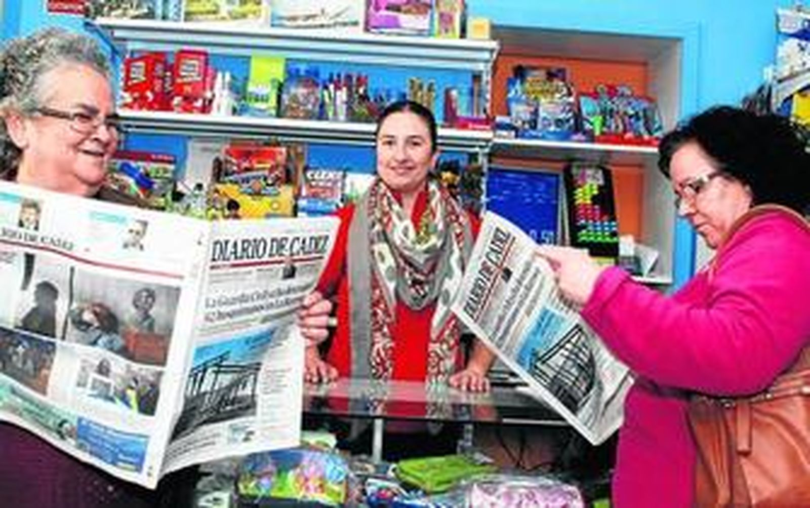 Es el caso de la papelería de María del Mar, en el pueblo gaditano a más distancia de la ciudad de Cádiz, en Alcalá del Valle, en la Sierra. Hace apenas un mes se hicieron con el traspaso de este comercio en la que continuarán vendiendo DiariodeCádiz, como hacía su anterior propietario. "De momento, cada día vendemos unos cinco ejemplares, un par de ellos para suscriptores y también lo compra alguna institución", comenta. En el momento que hacen la fotografía de este establecimiento alcareño llegan dos lectoras habituales, que no dudan en posar.