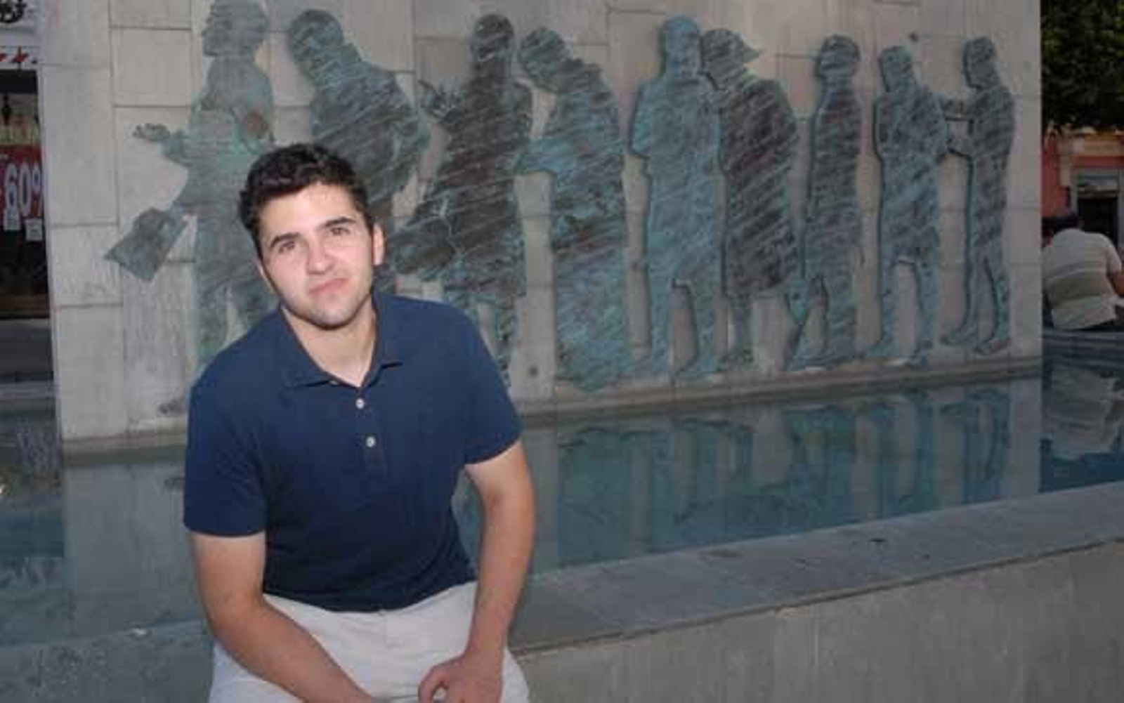 Alex Salinas posa sentado junto al monumento del Bicentenario de Las Cortes. /Rioja