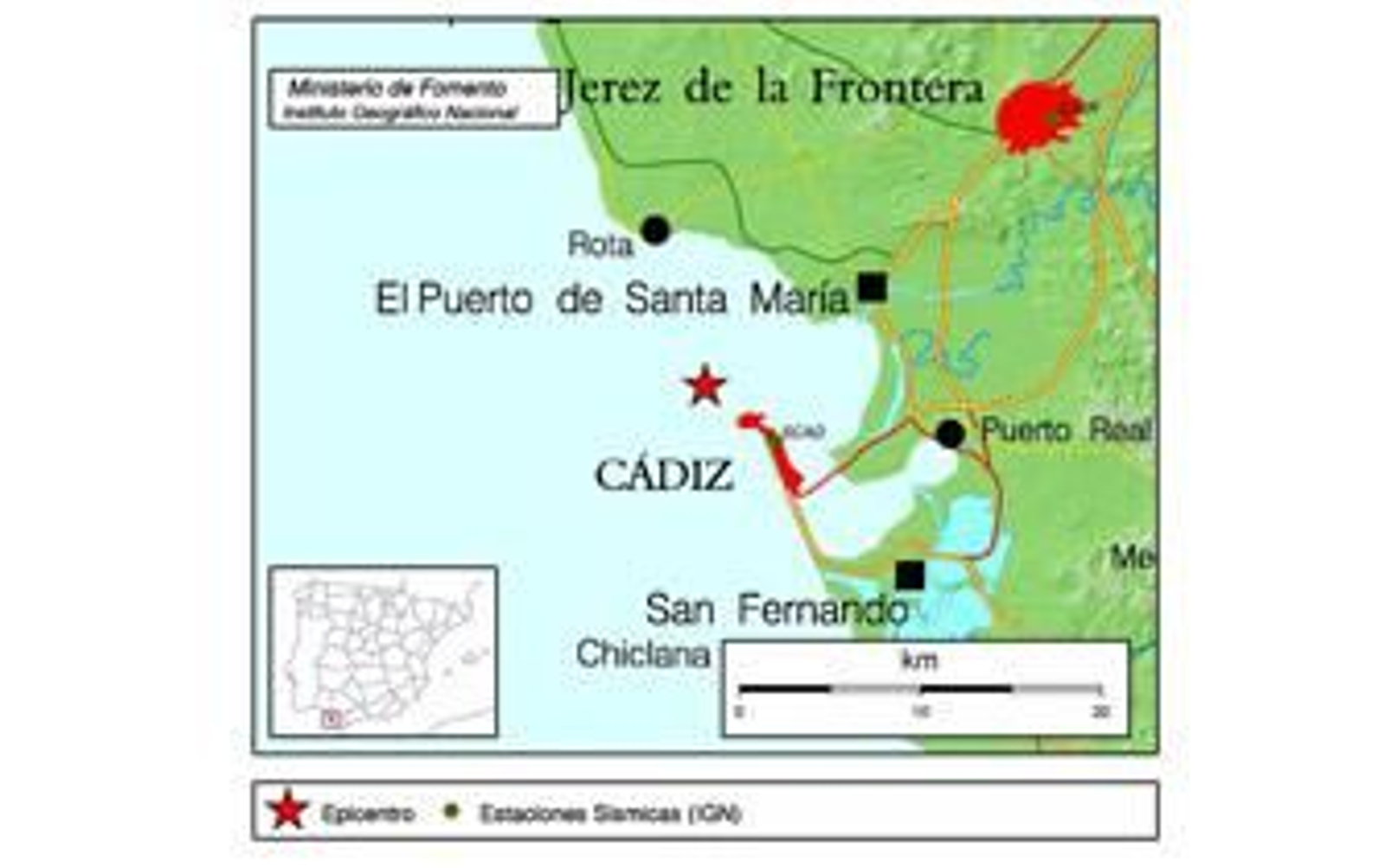 Como puede observarse en el gráfico, el Servicio de Sismología del Instituto Geográfico Nacional (IGN) detectó el epicentro del seísmo al norte de la capital y al suroeste de El Puerto a las 17:22 hora local (15:22 GMT) y le atribuyó una magnitud a partir de la amplitud de la fase Lg de 3.1. Esta fórmula es equivalente a la misma magnitud de la escala de Richter en un periodo de un segundo a una distancia de referencia de 100 kilómetros.