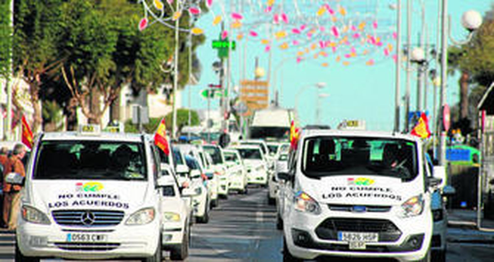 'IU no cumple los acuerdos' y 'No al reglamento por imposición', fueron algunos de los mensajes que se podían leer en los capós, laterales, ventanillas, lunas y zonas traseras de la treintena de taxis que se dieron cita en Conil para mostrar su apoyo a los 15 compañeros que se oponen a la entrada en vigor del nuevo Reglamento del Taxi aprobado en Pleno y que aún no ha entrado en vigor, ya que debe ser publicado en el Boletín Oficial de la Provincia (BOP) y después abrir un plazo de alegaciones, una posibilidad que ahora está en estudio.