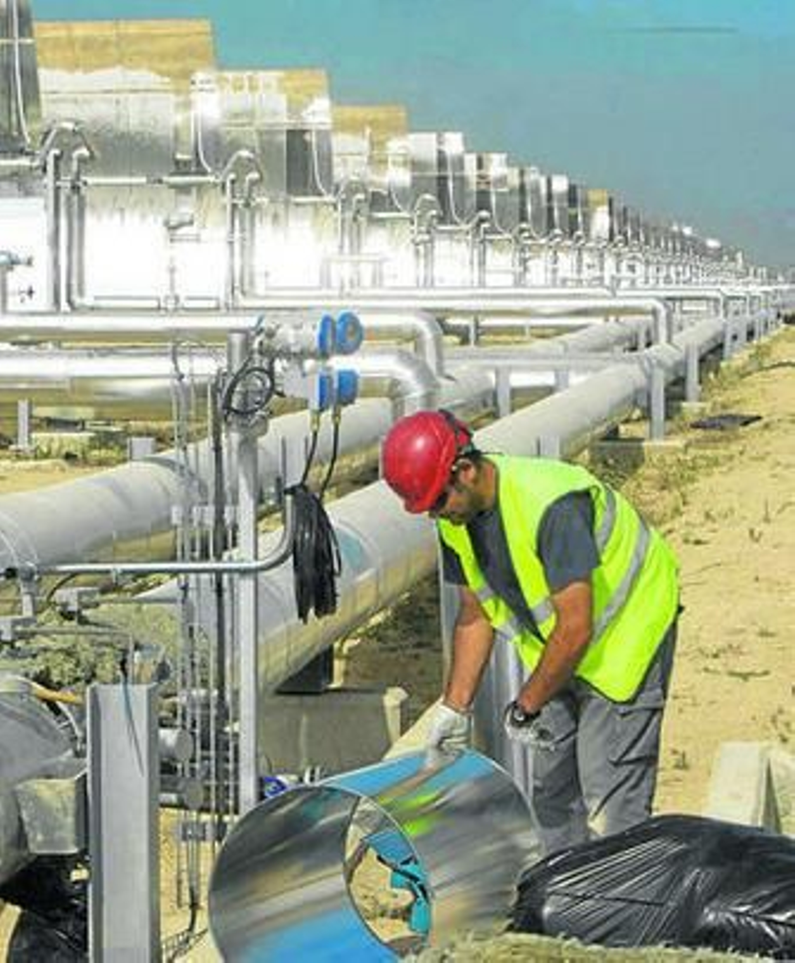 Estas plantas se diferencian de sus competidoras "en la forma de producir el calor que fabrica el vapor encargado de mover una turbina, lo que genera energía eléctrica", explica Grimaldi. Y es que Valle 1 y Valle 2, que ocupan unas 51 hectáreas, utilizan un innovador sistema que actúa de la siguiente manera: a través del calor recogido por un total de 624 espejos cóncavos dispuestos en fila y que oscilan según la hora del día, se concentra esta energía en un tubo de cristal por cuyo interior fluye aceite, que llega a alcanzar los 400 grados de temperatura. Este aceite llega a las plantas de potencia -una por cada campo conector-, que transfiere ese calor a sales fundidas almacenadas en dos tanques, uno "frío" (250ºC) y otro caliente (en torno a 400ºC), a través de los cuales se genera el vapor que mueven las turbinas que generan energía eléctrica.