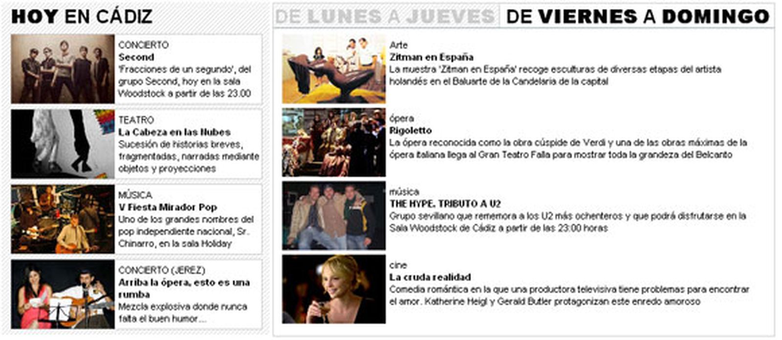 El lector puede encontrar, en un solo vistazo, lo más destacado del día, aquello que puede ver o asistir a lo largo de la semana y una selección para el fin de semana.