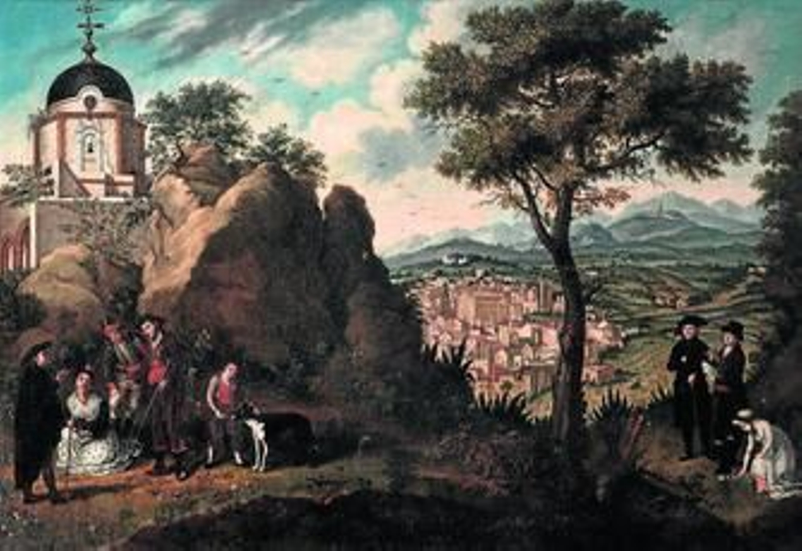 En el cuadro aparecen, en primer término, el propio pintor tomando notas para este mismo lienzo, junto al conde, ambos contemplando la iglesia de San Juan Bautista todavía en construcción. Junto a ellos, en una imagen bucólica, aparece la única hija del conde cogiendo flores. Puede apreciarse en sus atuendos el contraste de la España afrancesada frente a la España castiza: Riedmayer aparece vestido de marsellés mientras que la chica está elegantemente vestida con trajes a la europea. En el otro extremo del cuadro, un satírico fresco de las distintas clases sociales tradicionales: el clero -de espaldas-, el noble fumando -cazador ocioso- y el soldado cortejando a la gitana que sostiene un gato en su regazo. Junto a ellos, el niño que acaricia al perro simbolizaría al pueblo leal a las instituciones.