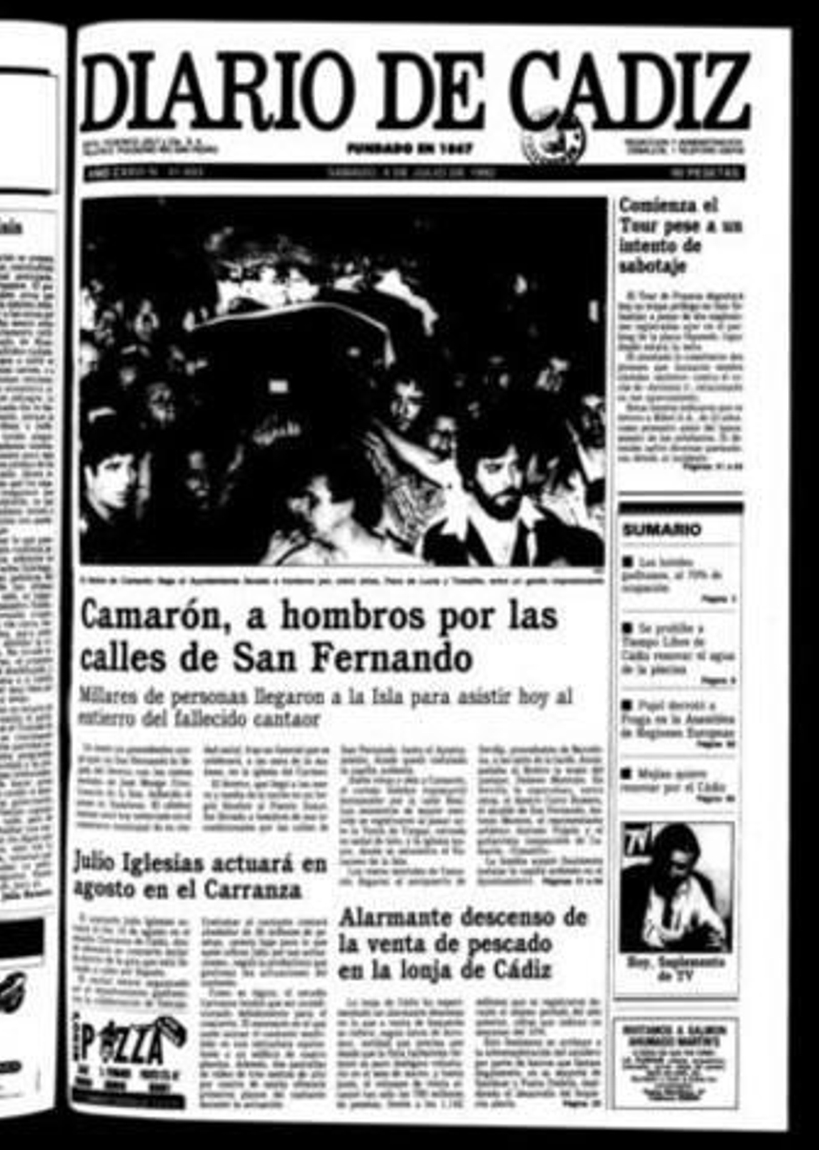 Cádiz se levantaba el día 3 de julio de 1992 con un triste titular en su periódico, El cadáver de Camarón llegará esta tarde a San Fernando. Este rótulo lucía en una portada que no fue la única que Diario de Cádiz dedicó al artista fallecido por aquellos primeros días de julio del año de la Expo. Así, al día siguiente, el rotativo volvía a dar relevancia a la pérdida del que fue un mito viviente en el flamenco y, en ese caso, dedicó una impactante fotografía de portada al féretro de Camarón portado por compañeros y amigos de la talla de Paco de Lucía y Tomatito. Una imagen a la que seguía el hermoso titular: Camarón, a hombros por las calles de San Fernando.