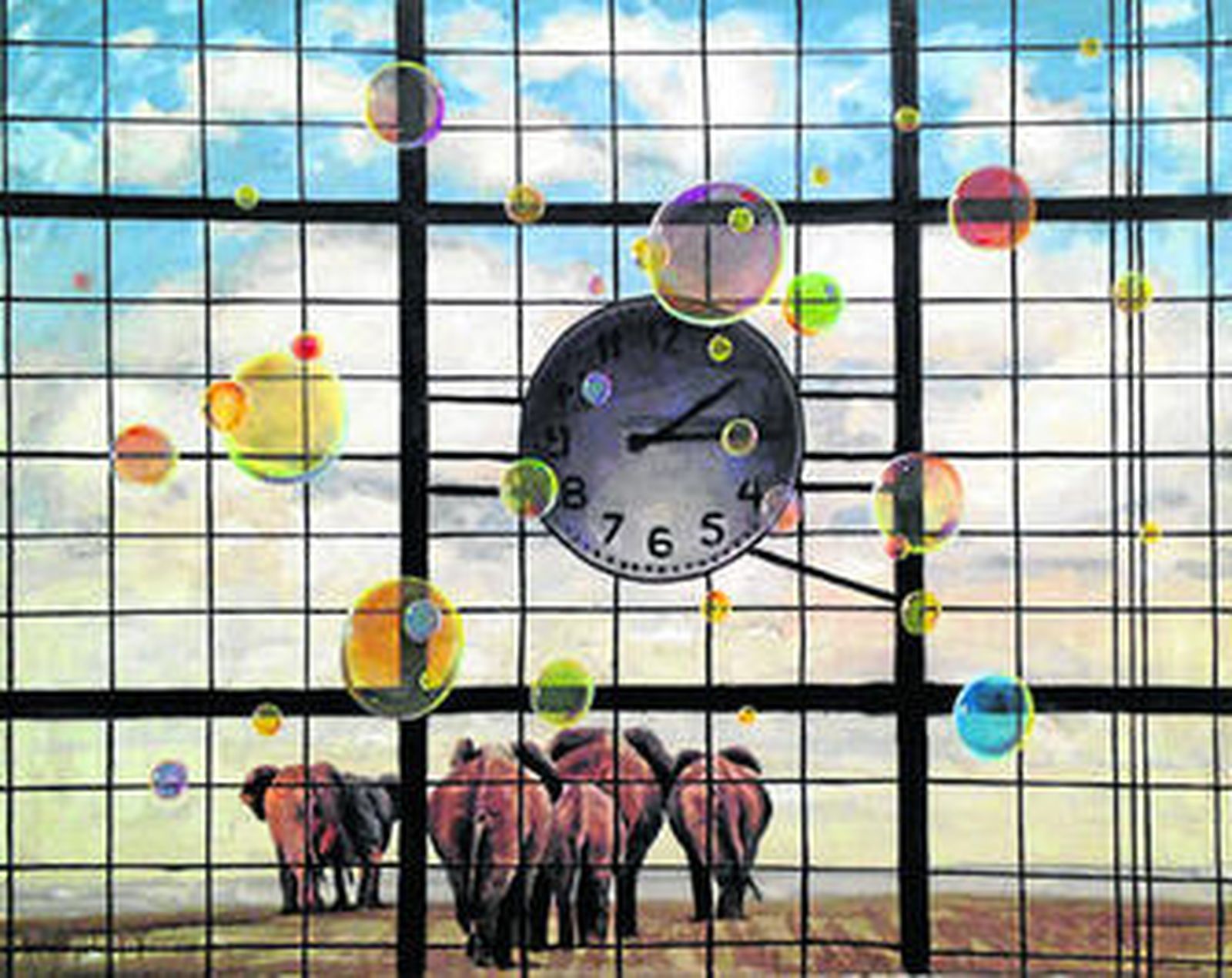 La exposición mantiene esa estructura conceptual que, últimamente, caracteriza el trabajo de Juan Ángel González de la Calle con la imagen sacada absolutamente de su contexto representativo para posicionarse en un escenario de supremas ambigüedades. Ahora, la realidad y sus circunstancias son sometidas por el pintor a una nueva dimensión. El discurso de lo real pierde su sentido y asume un nuevo planteamiento donde los elementos compositivos se yuxtaponen con un carácter diferente generando un paisaje ilustrativo distinto que potencia un juego de posturas bellamente imposibles. Así nos podemos encontrar obras que, tras la primera impactante impresión por su belleza formal, crean máxima inquietud. La gran nave central de una iglesia, una manada de elefantes vista desde el interior de la cristalera de una marquesina ferroviaria, una catarata de agua o una magnífica estación de trenes, ven parcialmente transformadas sus soberbias representaciones por unas coloristas pompas de jabón o burbujas que marcan un distanciamiento visual y significativo con una realidad sabiamente descontextualizada. Además, un espléndido cuadro de una geisha adopta una disposición especial y atípica en la puerta de un edificio barroco, un gran cuadro con la única leyenda wet floor (suelo mojado) preside una espléndida escalera, unas bandadas de pájaros vuelan majestuosamente en un paisaje interior y una serie de obras -las últimas realizadas por Juan Ángel- donde se nos presentan horizontes llenos de nubes o paisajes polares que aparecen bellamente alfombrados. Este absoluto juego visual, con lo real sutilmente dispuesto, para que se produzca una transformación semántica y su sistema significativo adopte un espíritu de marcado surrealismo; organigrama pararreal muy bien posicionado desde ese poder pictórico tan determinante que goza la pintura de este artista, con unos ilimitados y poderosos recursos plásticos que sirven de ideal soporte conformador para cualquier situación. Lo que hace que el espectador se sienta inmerso en las felices coordenadas de una pintura perfecta de composición, muy atractiva en cuanto a su ideario significativo y generadora de guiños cómplices para que la mirada transmita acertadamente al espíritu sus más emocionantes testimonios.