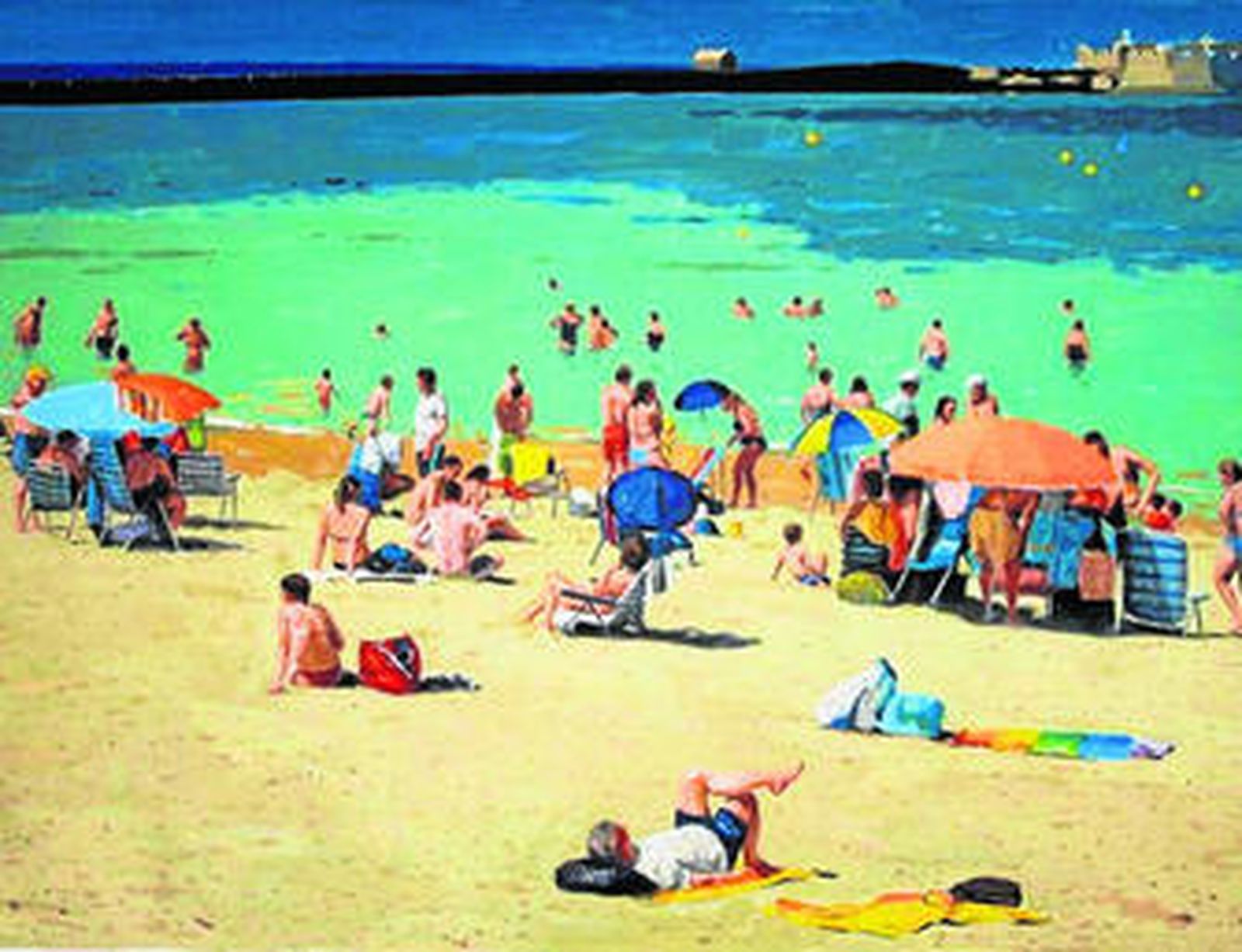 Así, de las curiosas distopías que teletransportaba un pingüino a La Caleta, por ejemplo, el pintor pasa a las escenas más reales y cotidianas vividas en la playa. Playas de toda la provincia de Cádiz, a las que acostumbra a ir en compañía de su mujer, y de las ha extraído el máximo jugo narrativo. "Son obras que no desprenden una argumentación tan definida como en trabajos anteriores, pero no quedan exentas de contar historias". Historias creadas por gaditanos, al hilo de su insistencia en "contar cosas de aquí, de personajes que bien podrían ser tu vecino, tu primo o tu hermano. Nada de reflejar al típico guiri que viene a Cádiz a veranear".