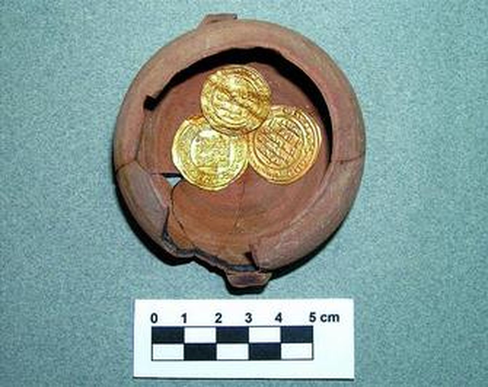 Las tres monedas de oro fueron halladas dentro de una pequeña jarrita en el hueco del suelo de una de las casas medievales.