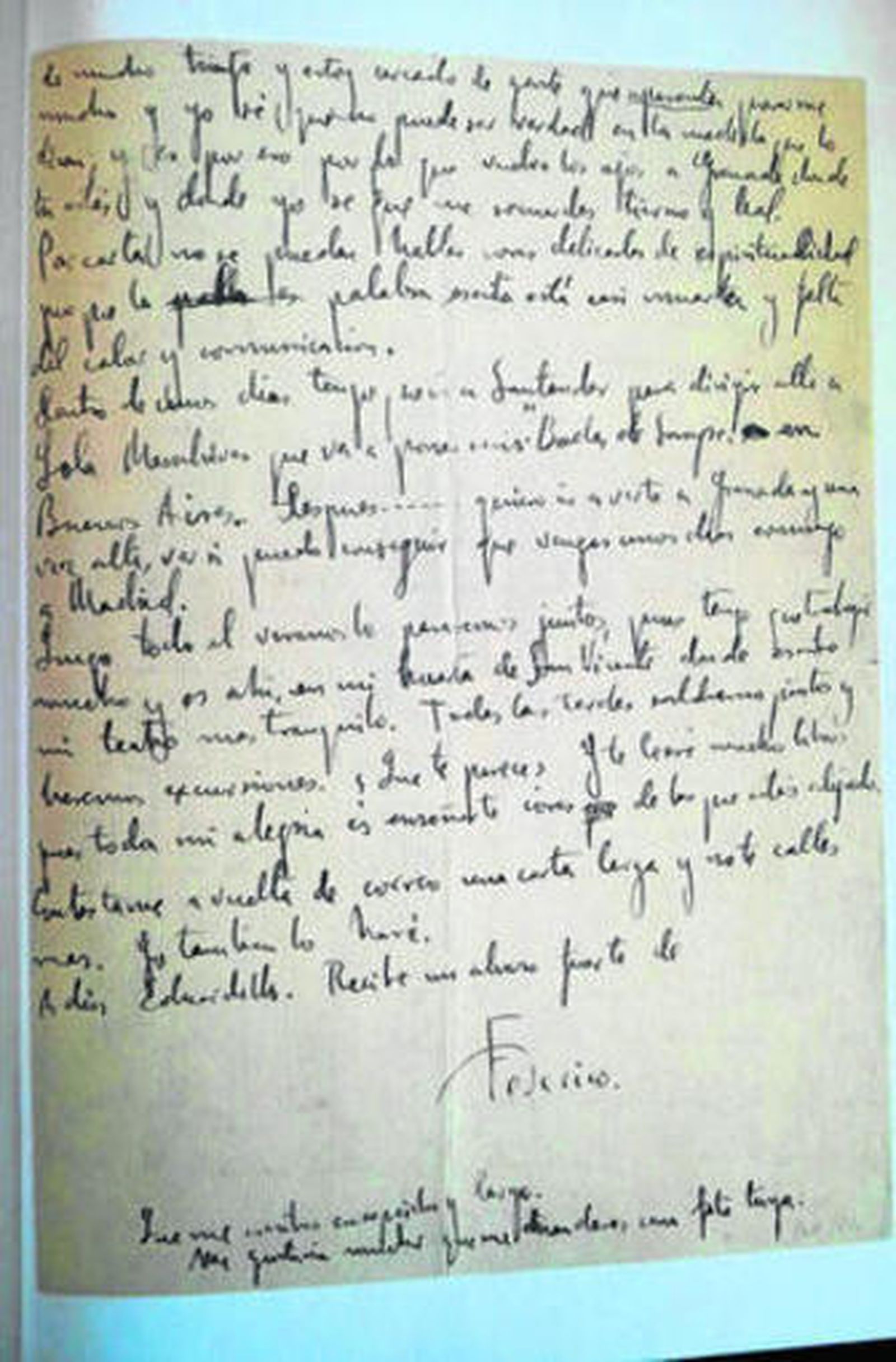 La última carta que recoge el libro está fechada abril de 1933 y el escritor insiste en que no lo ha olvidado "ni un instante". "Tú yo somos distintos de la gente vulgar y anodina que nos rodea y por eso soy tu amigo, porque tienes un alma hermosa que yo he visto muchas veces en la delicadeza de tu profunda mirada", le dice. "Tu carta me ha emocionado mucho y me ha hecho quererte mucho más. Te veo solo lleno de amor y de espíritu y de belleza y siento tu soledad como un hermoso paisaje donde yo dormiría para siempre", escribe para terminar pidiendo que guardase bien la carta, quizás consciente de que había desnudado su corazón en cada renglón. Después se muestra como un enamorado más: "Me asalta la idea de si tú no me querrás como yo a ti".