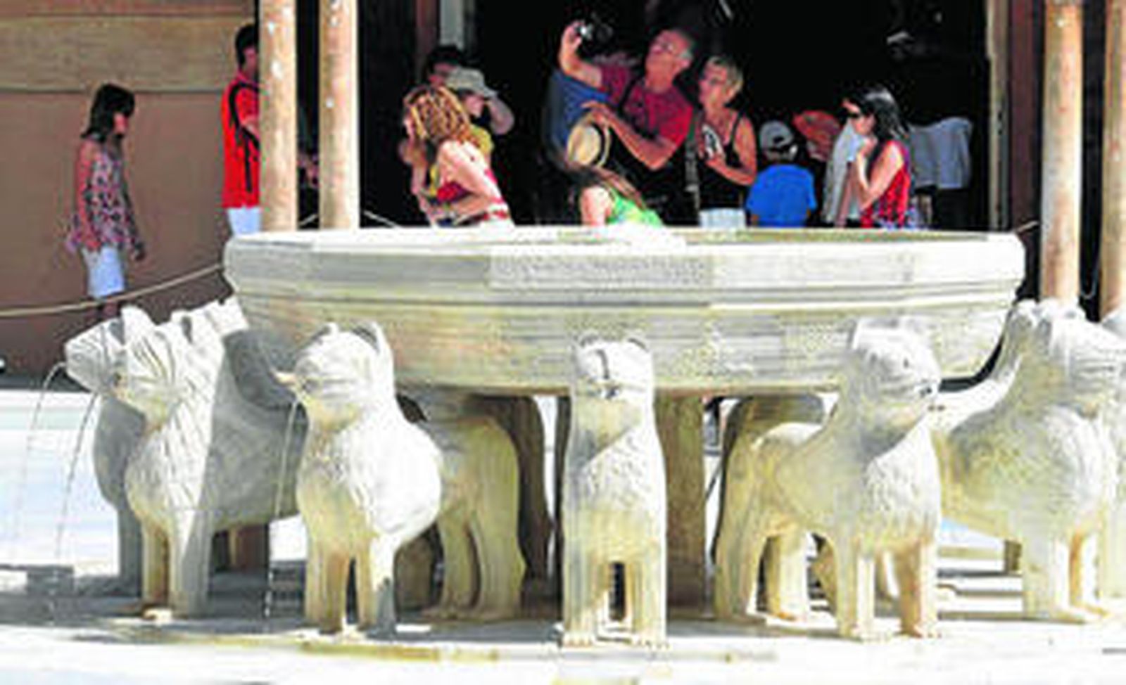 El jefe del Ejecutivo andaluz, José Antonio Griñán, fue el encargado de poner en marcha el nuevo sistema hidráulico, que ha hecho que los leones y la fuente vuelvan desde hoy a verter agua. Griñán destacó que los trabajos, llevados a cabo por equipos andaluces, han recuperado una parte sustancial de la historia, en una intervención que ha combinado "tradición y modernidad" y que permite ver y escuchar el patio como hace siglos.