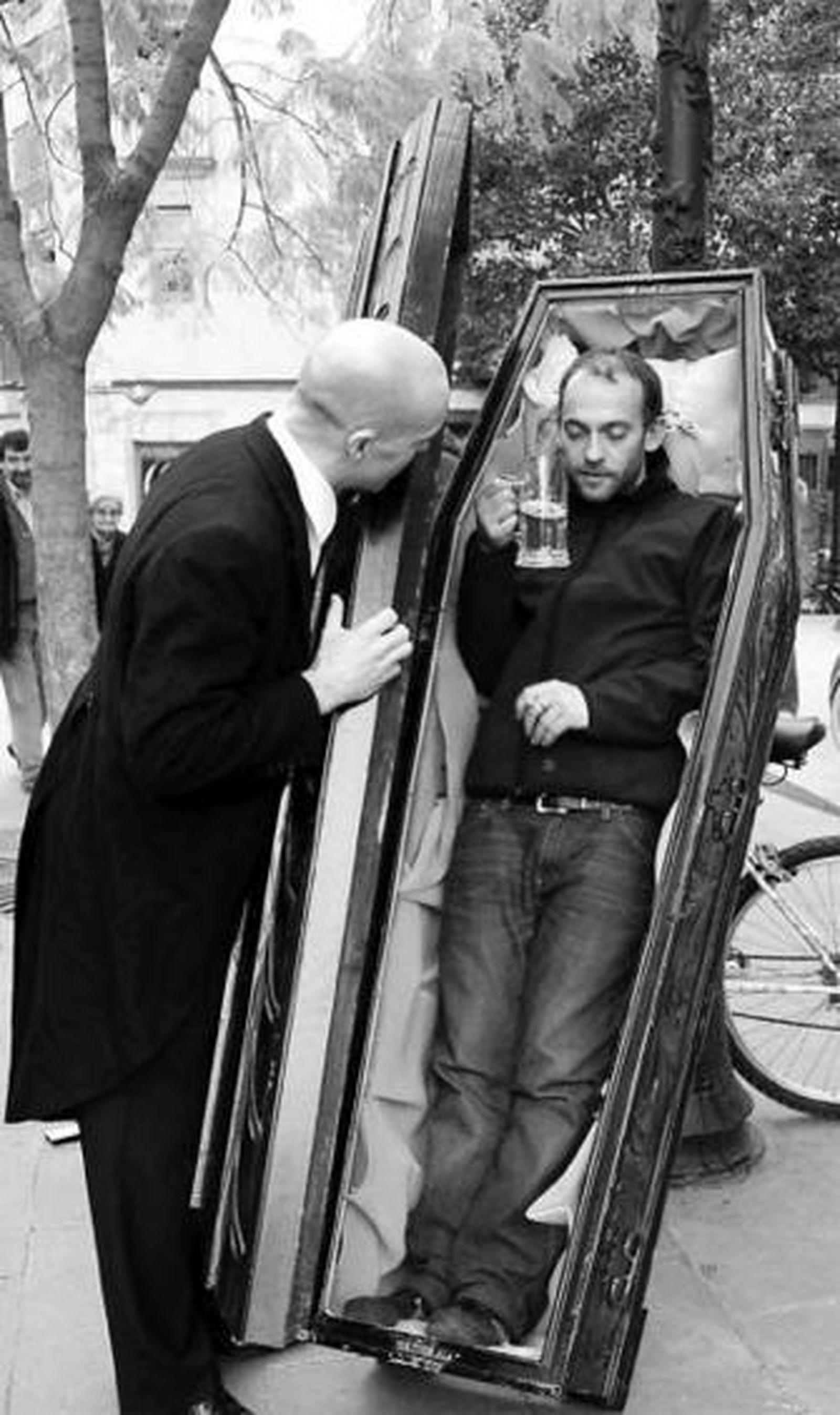 ¿Tienen ustedes miedo a la muerte? Oriol Aubets alza el teléfono y el resto de miembros de Encara Farem Salat responden al unísomo, como una lección aprendida: "¡Nooo! ¡Ella nos debe de temer a nosotros!". Hablan los cuatro enterradores mudos. Los que llevan el ataúd. Los que están en paro en un mundo donde las incineraciones destierran a las inhumaciones tradicionales. Ahora (por ayer) van en coche. De Guadalajara a Cádiz. Estos días irán a pie, en surrealista comitiva, de Loreto a La Laguna, de Los porches a San José, de San Antonio a la Catedral. Los hombres de negro (persígnese) de la compañía Encara Farem Salat (EFS) se ríen de la muerte. "Eso es algo muy sano porque, al final, nos guste o no es algo que nos tocará a todos", Aubets, relativiza -que no frivoliza- sobre la llegada de la temida Parca que sirve de sostén a un espectáculo de calle "que no va a dejar indiferente a nadie".