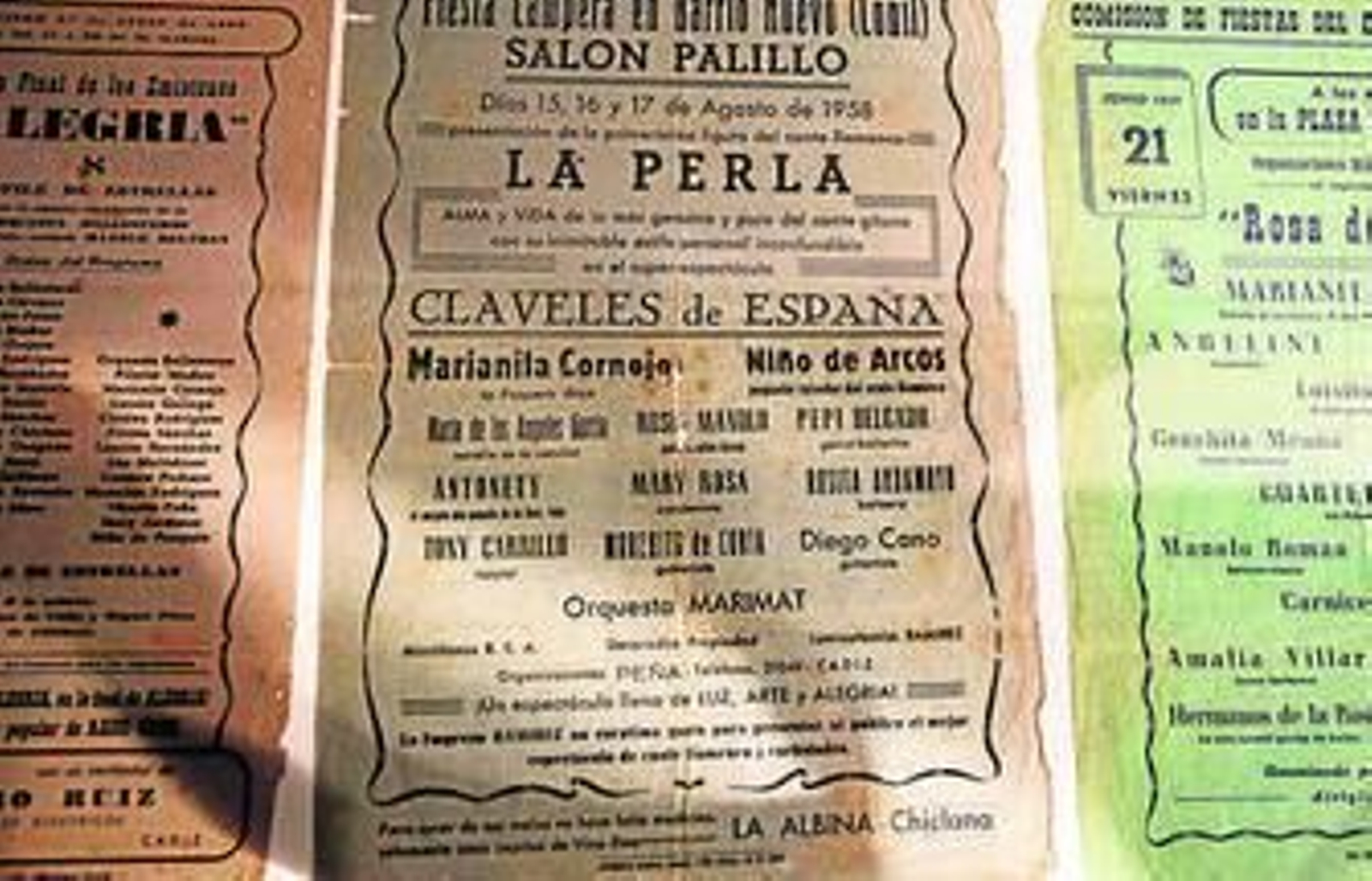 Y la cartelería. La cartelería que nos dice que en un momento era "la mascotilla de la radio", en otro "La Paquira" (por su tío Paquiro) y que ya desde el 56 empezó a ser anunciada como Marianita Cornejo. La cartelería que nos cuenta que actuó con La Perla, entre otras figuras del cante de Cádiz, y cómo fue ascendiendo su carrera pasando su nombre, cada vez, más arriba, cada vez, mejor rotulado, cada vez, más grande.