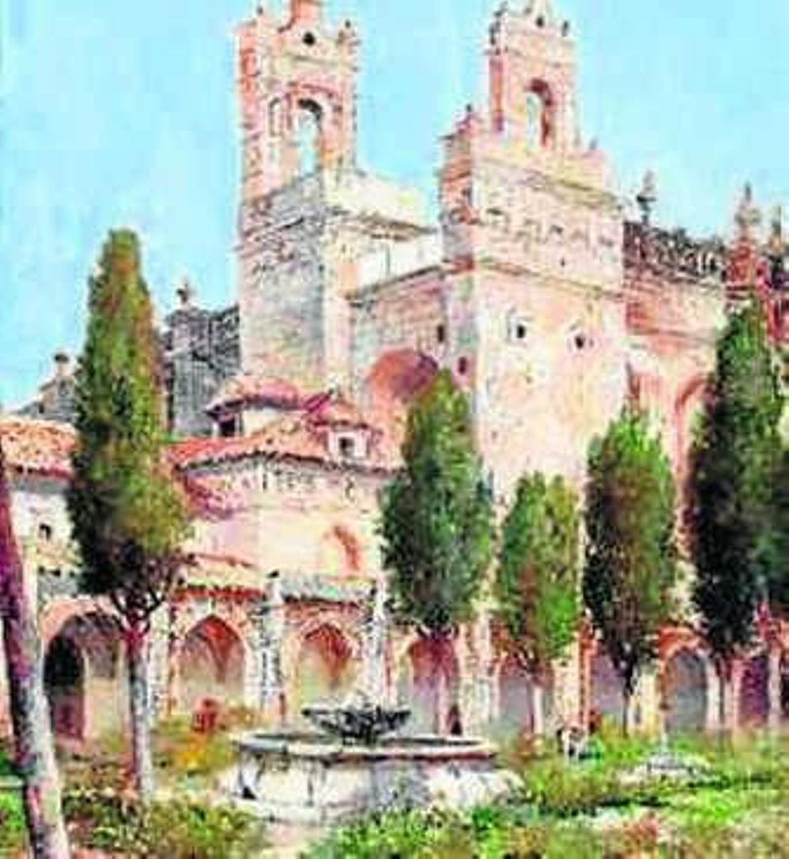 La obra del pintor gaditano José Montenegro y Capell (Cádiz, 1853-Jerez, 1929) Vista del claustro grande de la Cartuja de Jerez de la Frontera (lote 1442) se subastará en la Sala Balclis mañana y pasado, 24 y 25 de octubre. La pieza, que es un óleo sobre lienzo, con firma, localizado y fechado en 1893, saldrá a subasta por el precio de 900 euros.