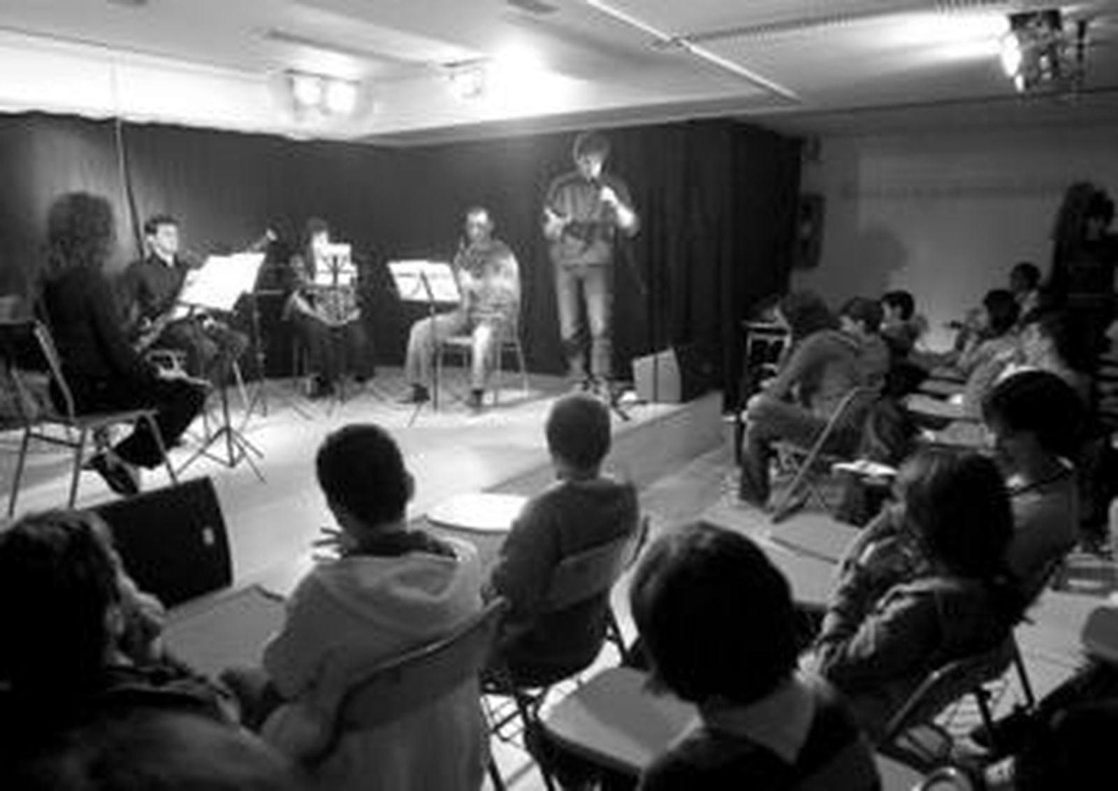 "Esto es un oboe", comenzó Mónica Guerrero mostrando el instrumento que sostenía en sus manos. Contó que pertenece a la familia de los instrumentos de viento madera y que su embocadura está formada por una doble caña que se ata alrededor de un pequeño tubo metálico. Y explicó a los alumnos cómo se produce la música en este instrumento y su evolución histórica. "Es el que da la nota de afinación en la orquesta porque es el que tiene el sonido más penetrante", argumentó antes de mostrar al público que abarrotaba el salón de actos del instituto cómo suena, interpretando un fragmento del tercer movimiento del Quinteto mi bemol mayor Op 88 de Reicha, que los músicos iban a tocar por la tarde en el Museo.