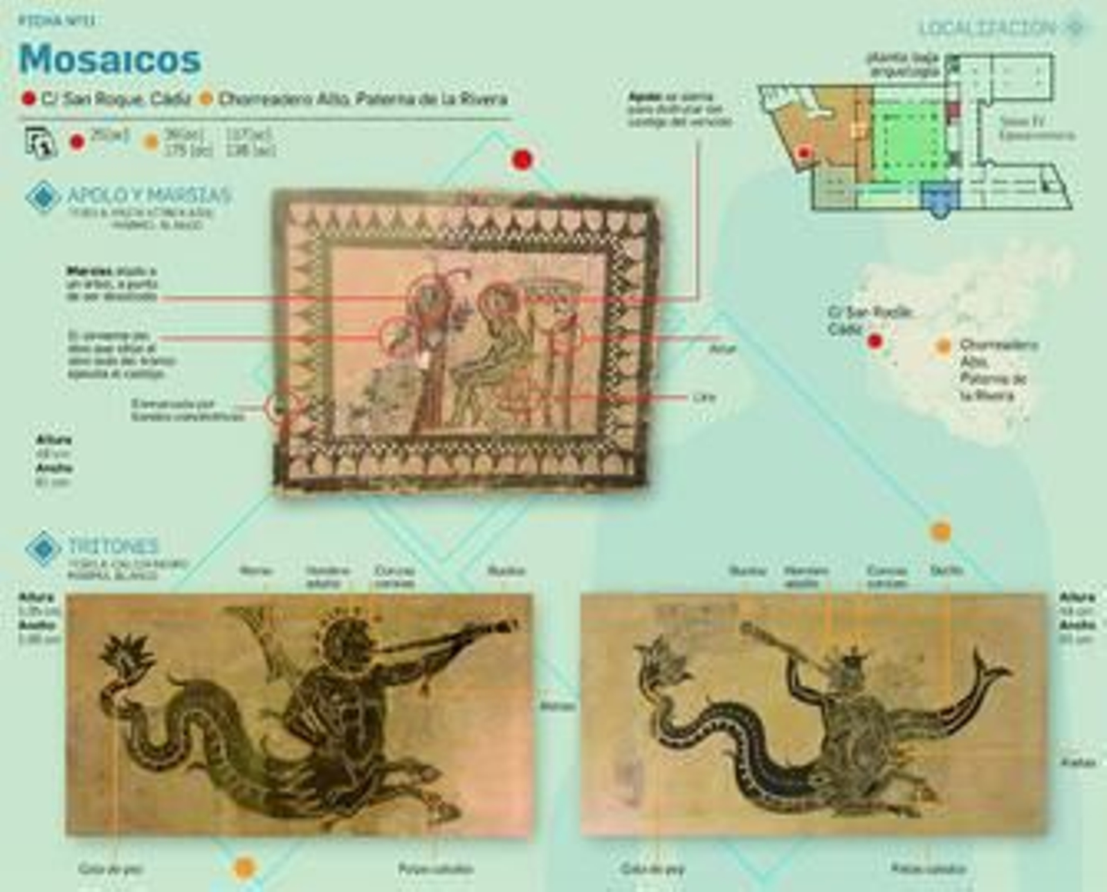 Asevera el director del Museo que los artesanos solían copiar pinturas de autores famosos, que generalmente son de temas mitológicos, como es este caso, pues la obra recoge el duelo musical entre Apolo y Marsias, en el momento en que la divinidad se sienta para contemplar el castigo de muerte del osado Marsias. Una obra conformada por teselas polícromas y que se encontró conservado en su totalidad, a excepción de ángulo superior izquierdo.
