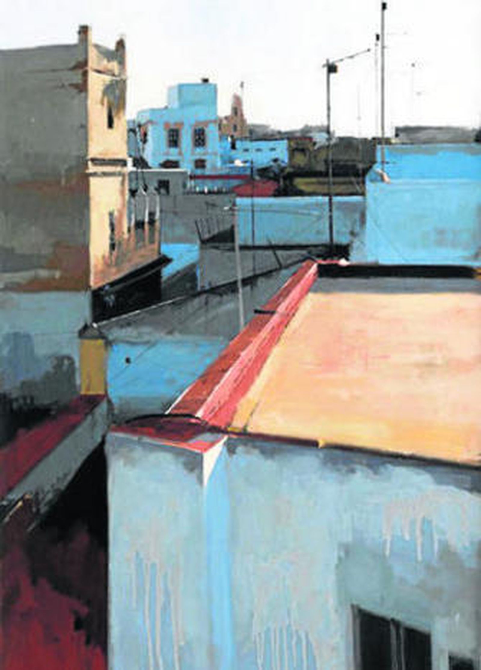 La muestra Entre Azoteas la componen grandes reproducciones de cuadros, en los cuales sobre los colores cálidos aparecen los perfiles que van creando una sugestiva visión de este paisaje urbano. Bajo una geometría ordenada, colores, luces y sombras conforman el itinerario de un juego invisible que inconscientemente te transporta de plano en plano, de los blancos a los grises, azules, hasta el horizonte y hasta el cielo claro e impoluto. No hay ni una nube ni una borrasca, ¡qué amabilidad la de Cecilio!, para sus pinturas no existe crisis ni futuro incierto. Tal vez porque, como él mismo dice, el escenario de su niñez, de sus celebraciones familiares, de sus juegos y gamberradas se mantiene en su memoria y en sus cuadros para llenar, así, el vacío que siente desde que se marchó de Cádiz.