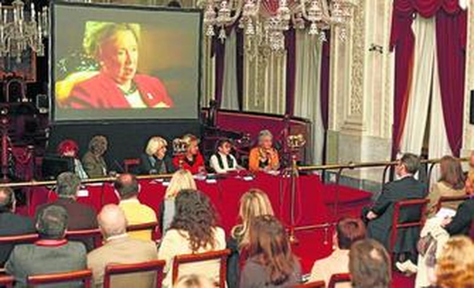 Una pantalla instalada en mitad del salón de plenos, acondicionado de manera especial para la ocasión, sirvió para la proyección de diez minutos de Las constituyentes, en concreto el tramo final de la película, que resume el espíritu de un documental femenino que da la voz a las mujeres y que lo hace de manera plural, con opiniones procedentes de prácticamente todos los rincones políticos del arco parlamentario de entonces y de ahora.