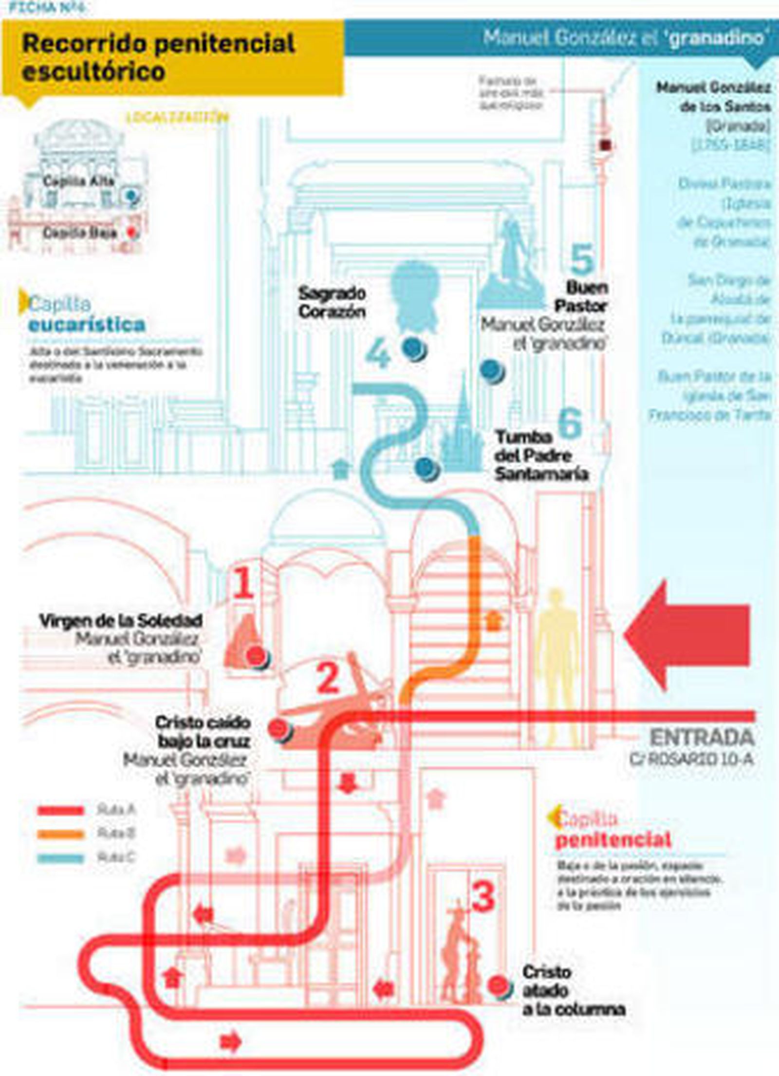 Nada más acceder a este espacio por el vestíbulo, el visitante se encuentra de cara un camarín protegido con una vidriera con la escultura de Nuestra Señora de la Soledad, que aparece sentada y mirando al cielo, triste, austera, ataviada con manto negro y bajo la que aparece la inscripción latina 'Andad, hijos, andad, porque y he sido dejada sola'. Otra obra suya puede verse muy cerquita en este itinerario, al bajar la escalera hacia la capilla baja, donde se erige la escultura de Jesús Nazareno caído bajo el peso de la cruz, bajo un arco donde luce la inscripción también en latín 'Todo el que desee alcanzar el reino eterno del cielo, venga sediento a este lugar, pues aquí está preparado el camino'.