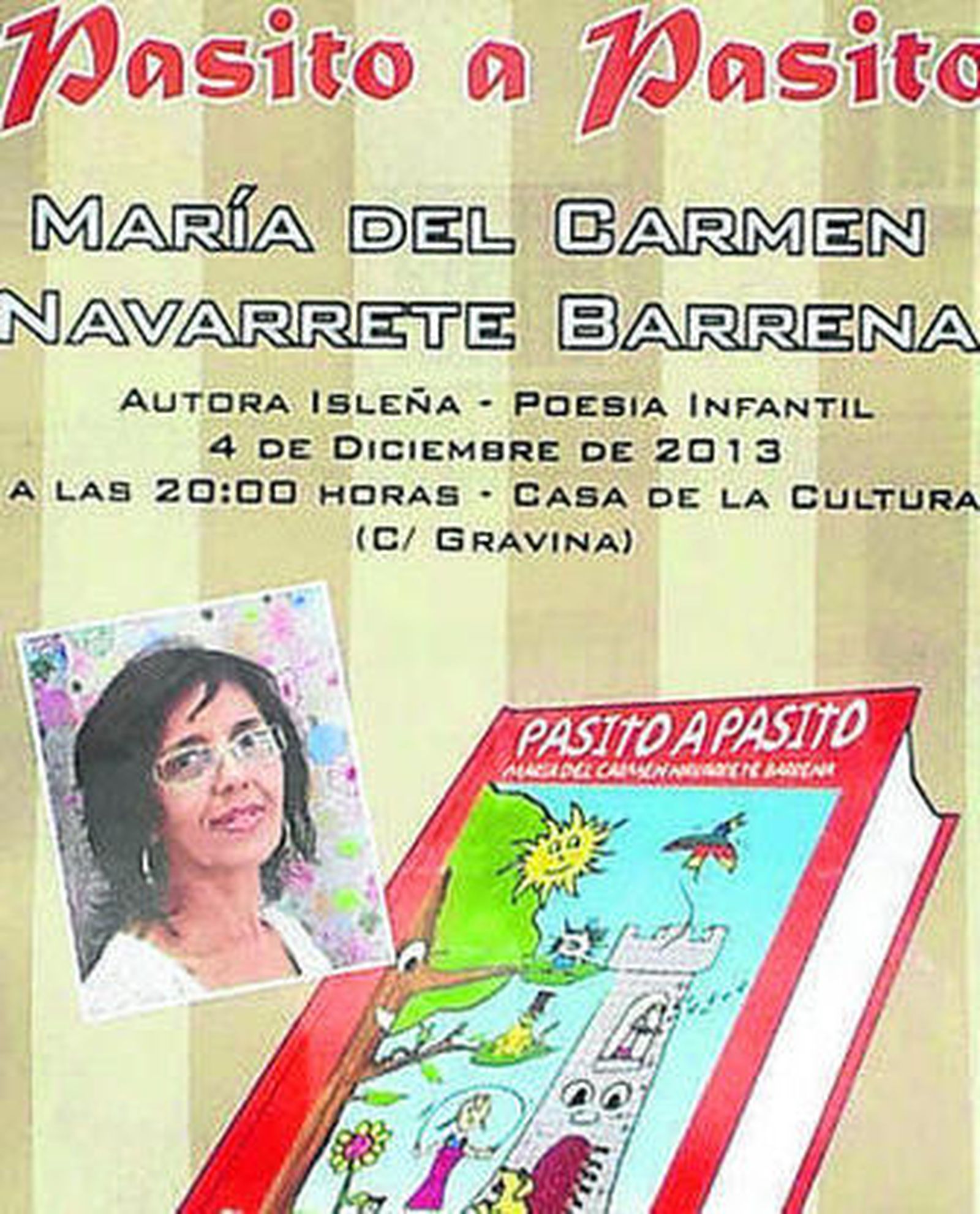 Con el firme objetivo de fomentar la lectura de poesía entre los más pequeños ha surgido la obra literaria Pasito a pasito, de María del Carmen Navarrete Barrena. La autora isleña da un paso en firme en un terreno en el que no abunda este tipo de literatura poética dirigida a niños y jóvenes lectores.