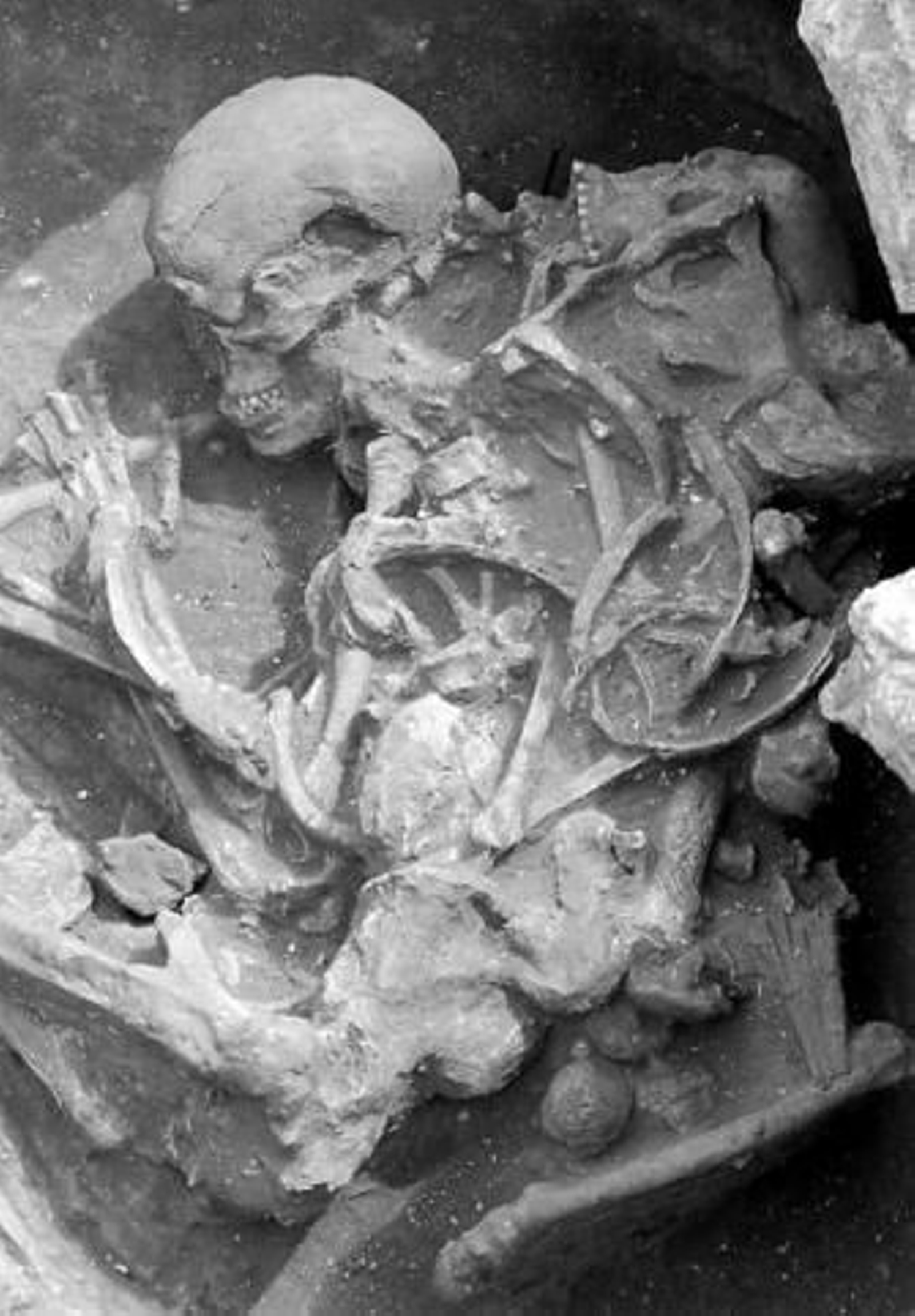 A su alrededor han aparecido otros cinco enterramientos de niños en forma circular y dos cúmulos de piedra orientados hacia el enterramiento principal. Remata el conjunto el anillo perimetral que les rodea, aún susceptible de ser analizado. "Sin duda se trataba de dos individuos muy importantes". Un dato que corrobora el ajuar encontrado en el interior, compuesto por hachas bien pulimentadas, un objeto cerámico y cinco agujas de hueso. A esto hay que añadir el pigmento color rojizo que se desprende de sus caderas, "que debía responder a algún rito mágico o religioso", puntualiza Eduardo Vijande. También está en fase de estudio la aparición de un corredor de acceso al enterramiento.
