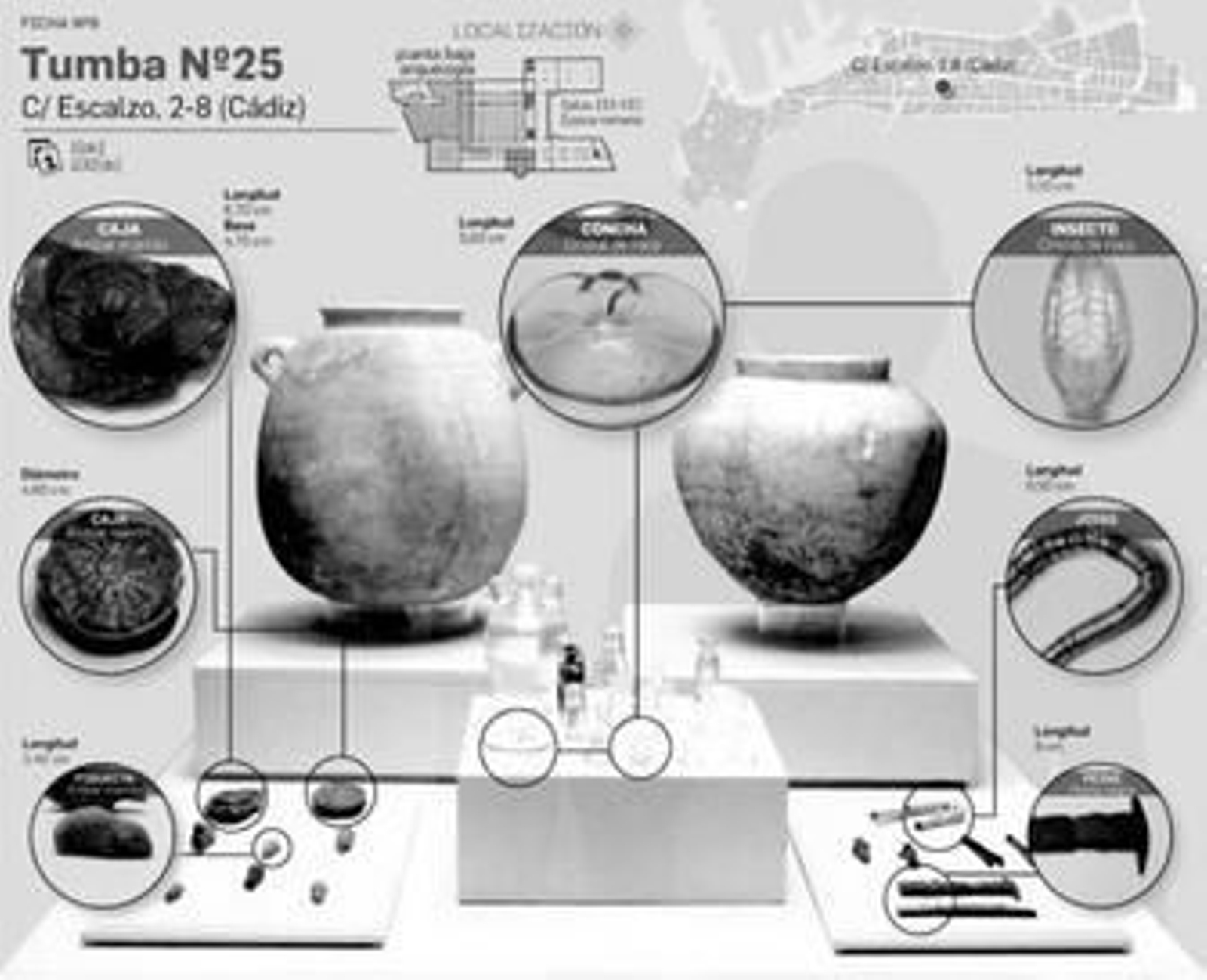 Uno de los más valiosos y singulares ajuares jamás localizados de la época del Gades romano apareció en el interior de una gran tumba de sillares recubierta de opus caementicium, en un solar de la calle Escalzo, en el año 1997.